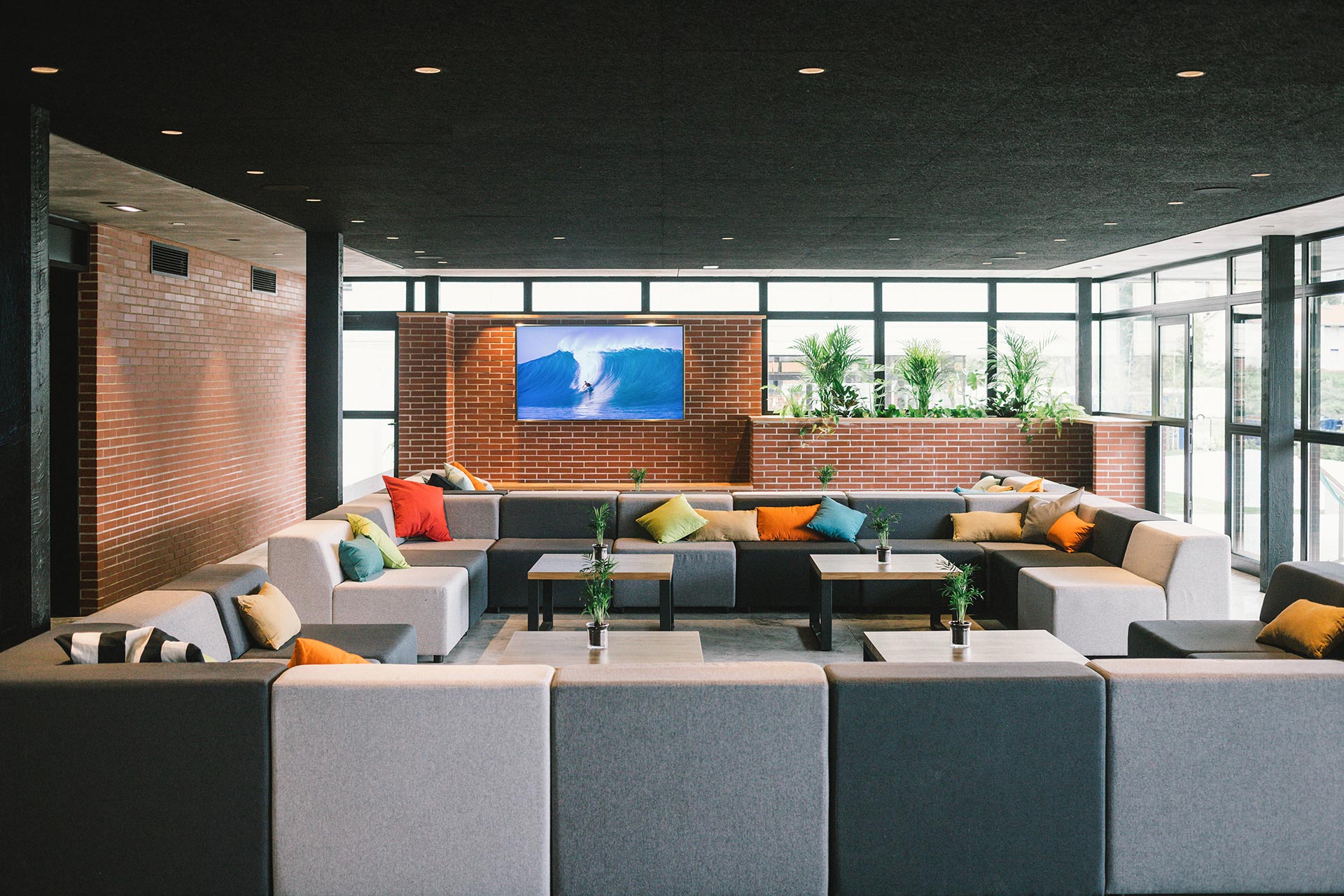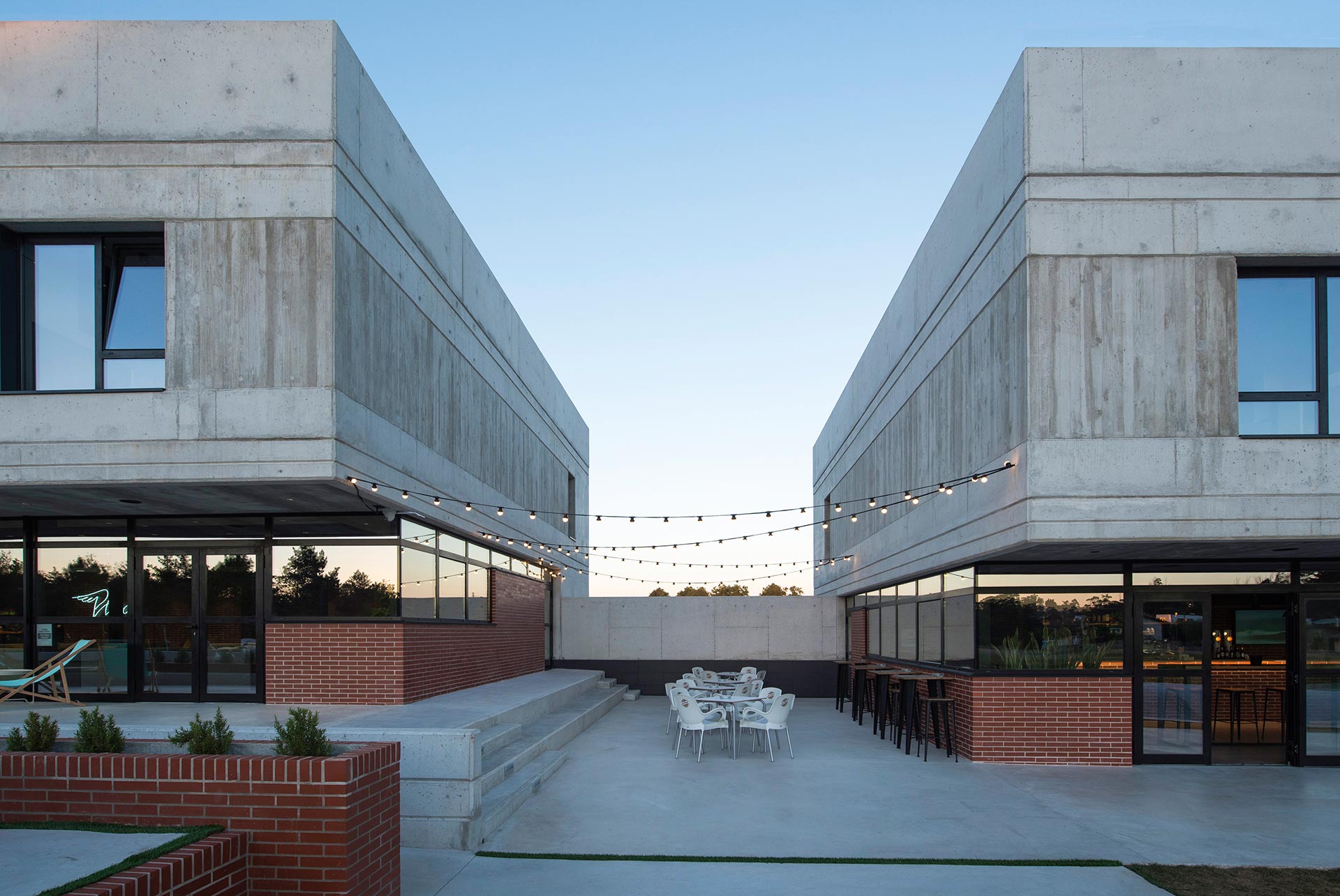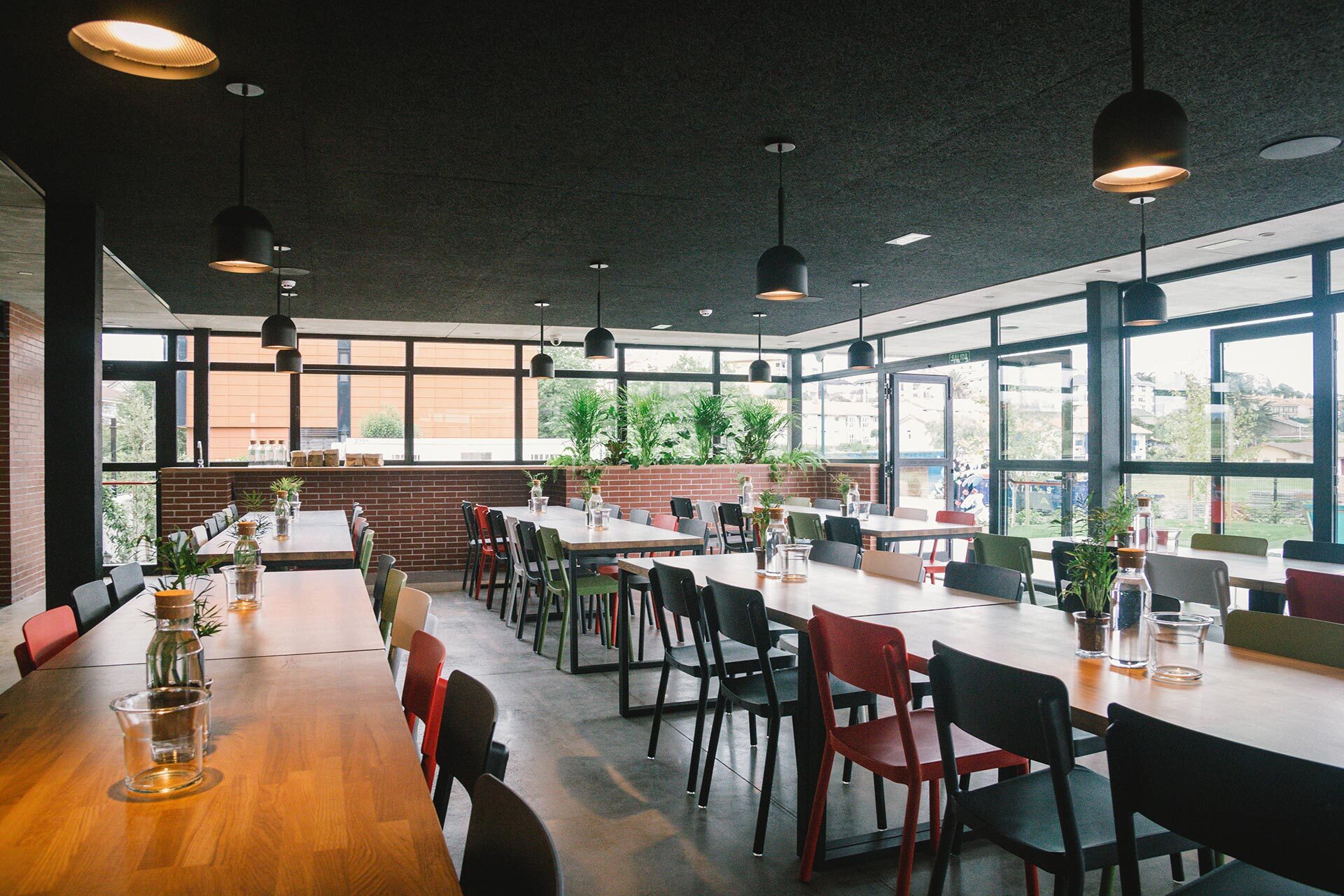En los espacios públicos se crea un ambiente desenfadado y amable con colores vivos en el mobiliario y una estética urbana que combina la firmeza del hormigón, la sencillez del ladrillo y la calidez de la madera. El interior se dilata hacia el exterior gracias a las grandes cristaleras y al tratamiento de los materiales y la vegetación que se prolonga hacia el exterior.
