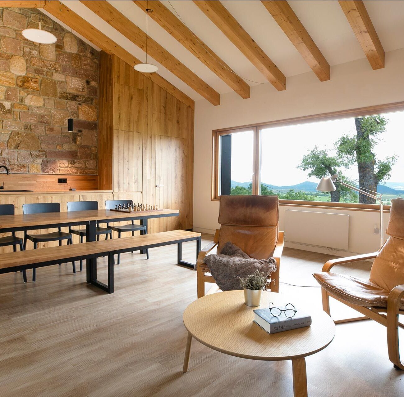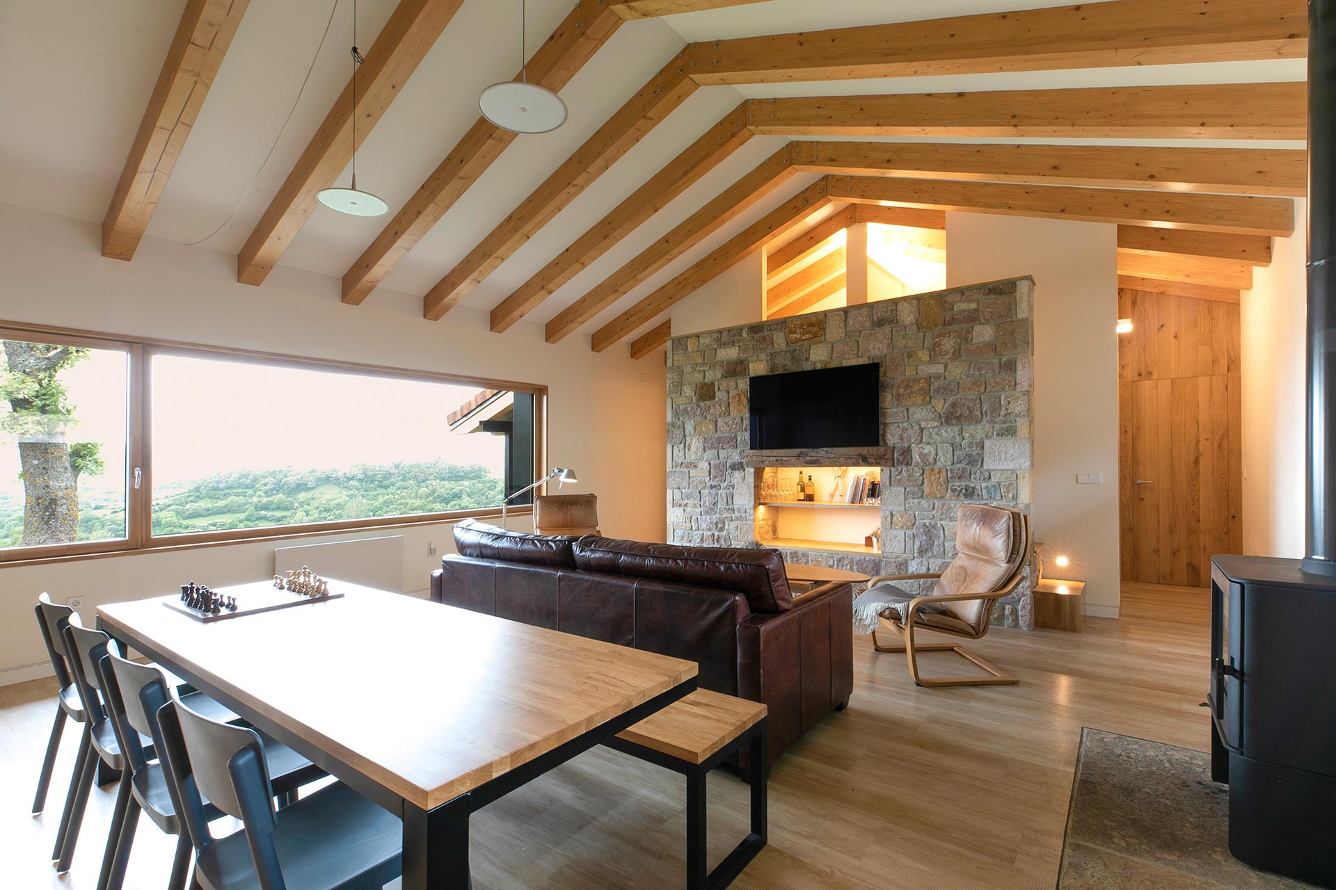El corazón del alojamiento es la estancia de salón-comedor-cocina, que se configura como un espacio en doble altura al que vuelcan todos los dormitorios. En este espacio se introducen vistas del valle campurriano a través de dos grandes ventanales panorámicos.