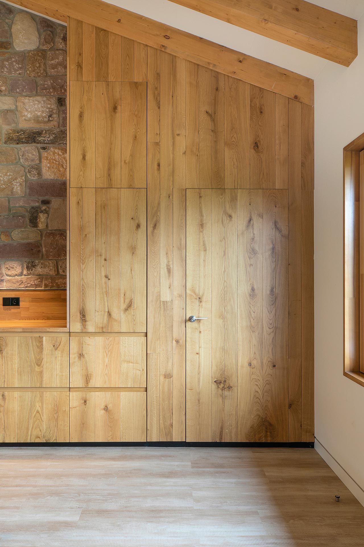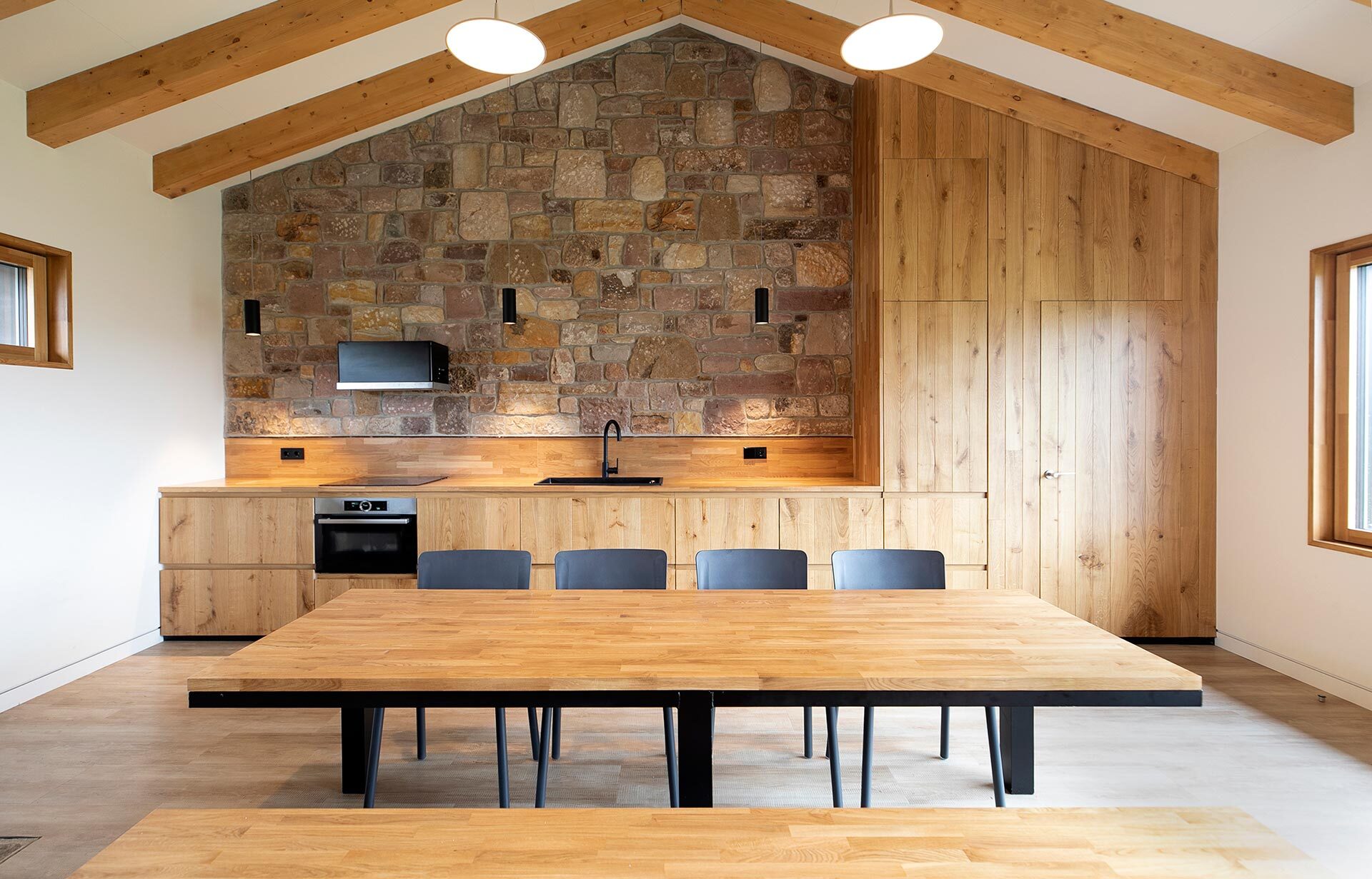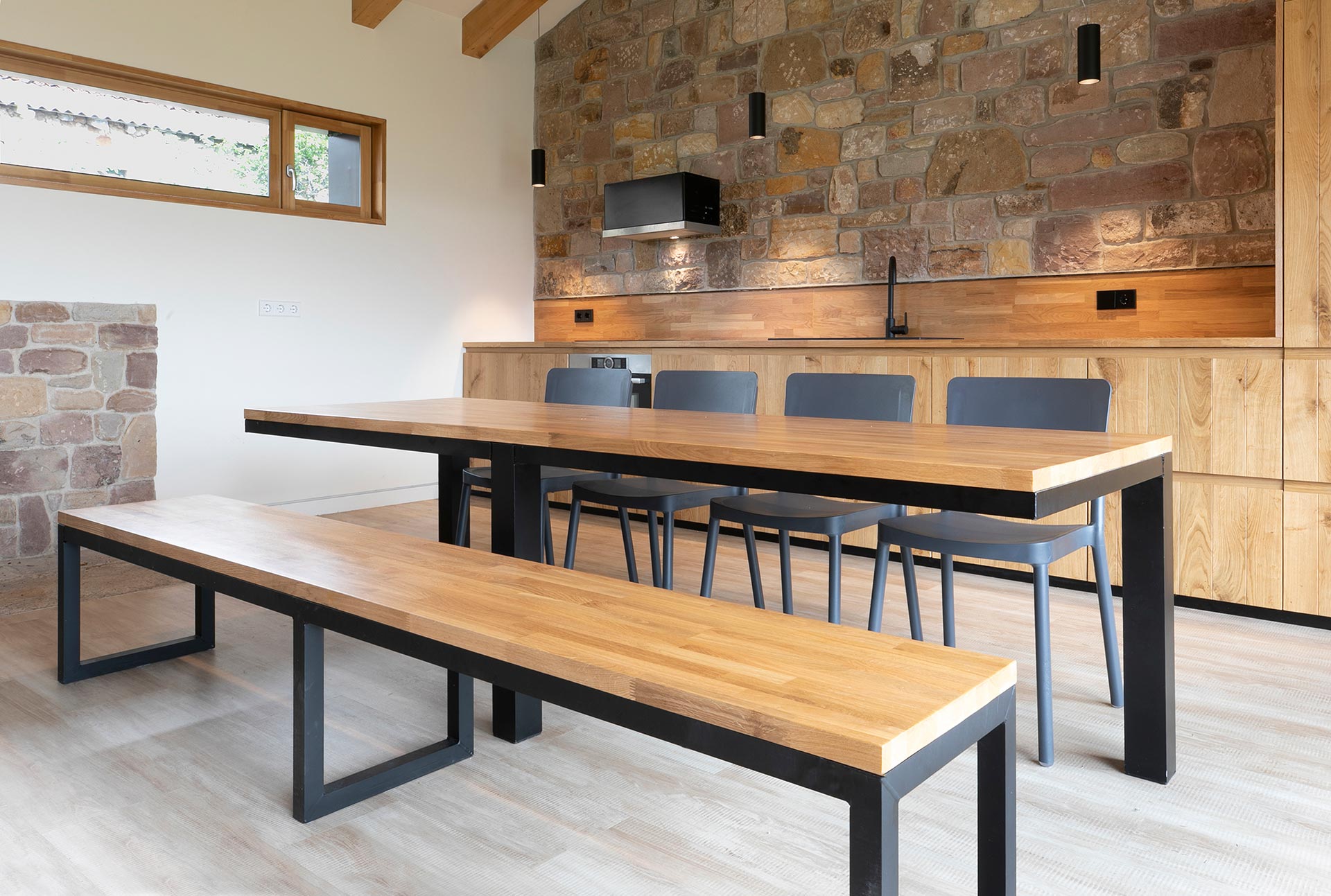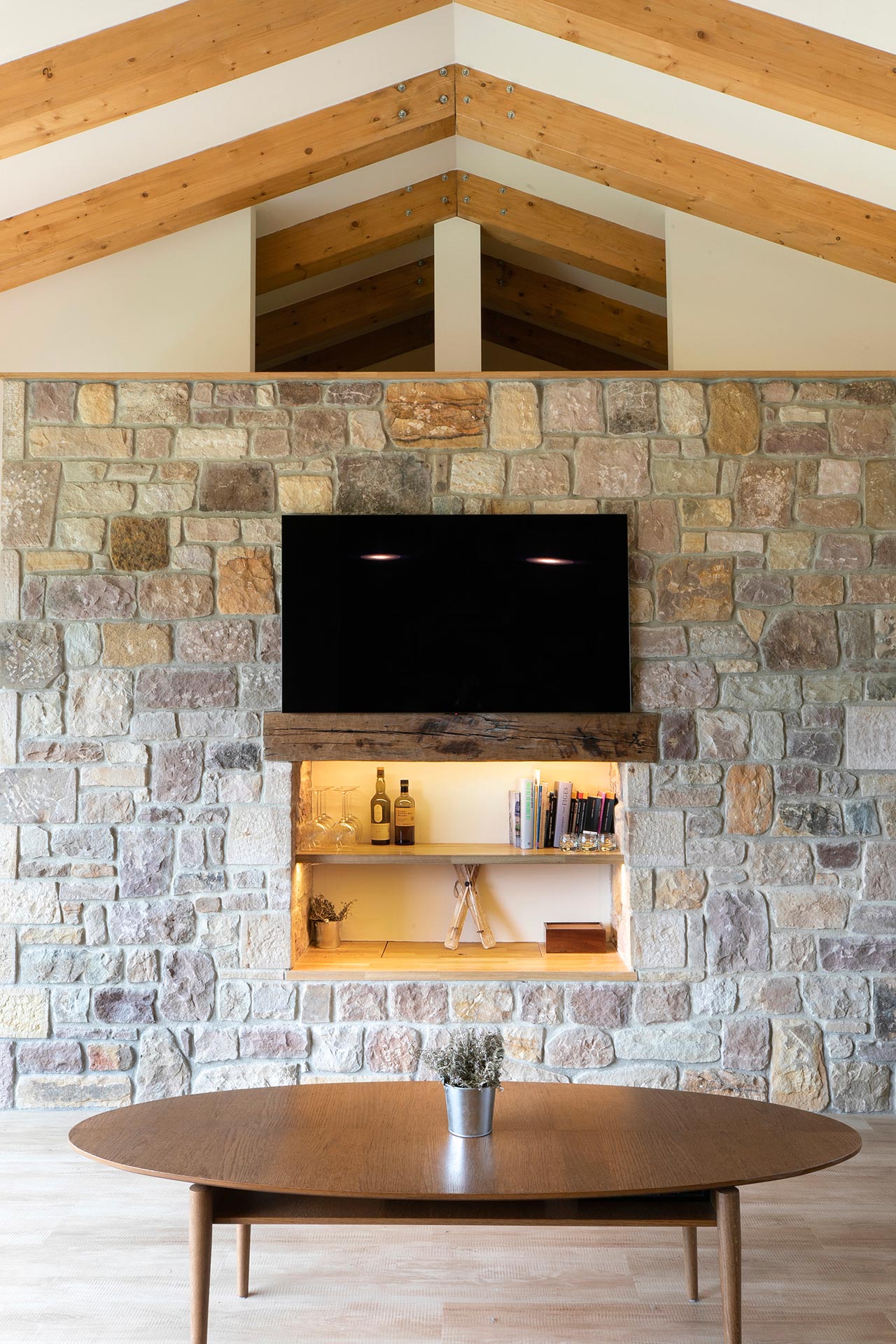 En el interior se refuerza el carácter de refugio mediante la combinación de madera de roble y piedra caliza en suelos, paredes y mobiliario. Estos materiales moldean artesanalmente las superficies creando un ambiente cálido y evocador.
