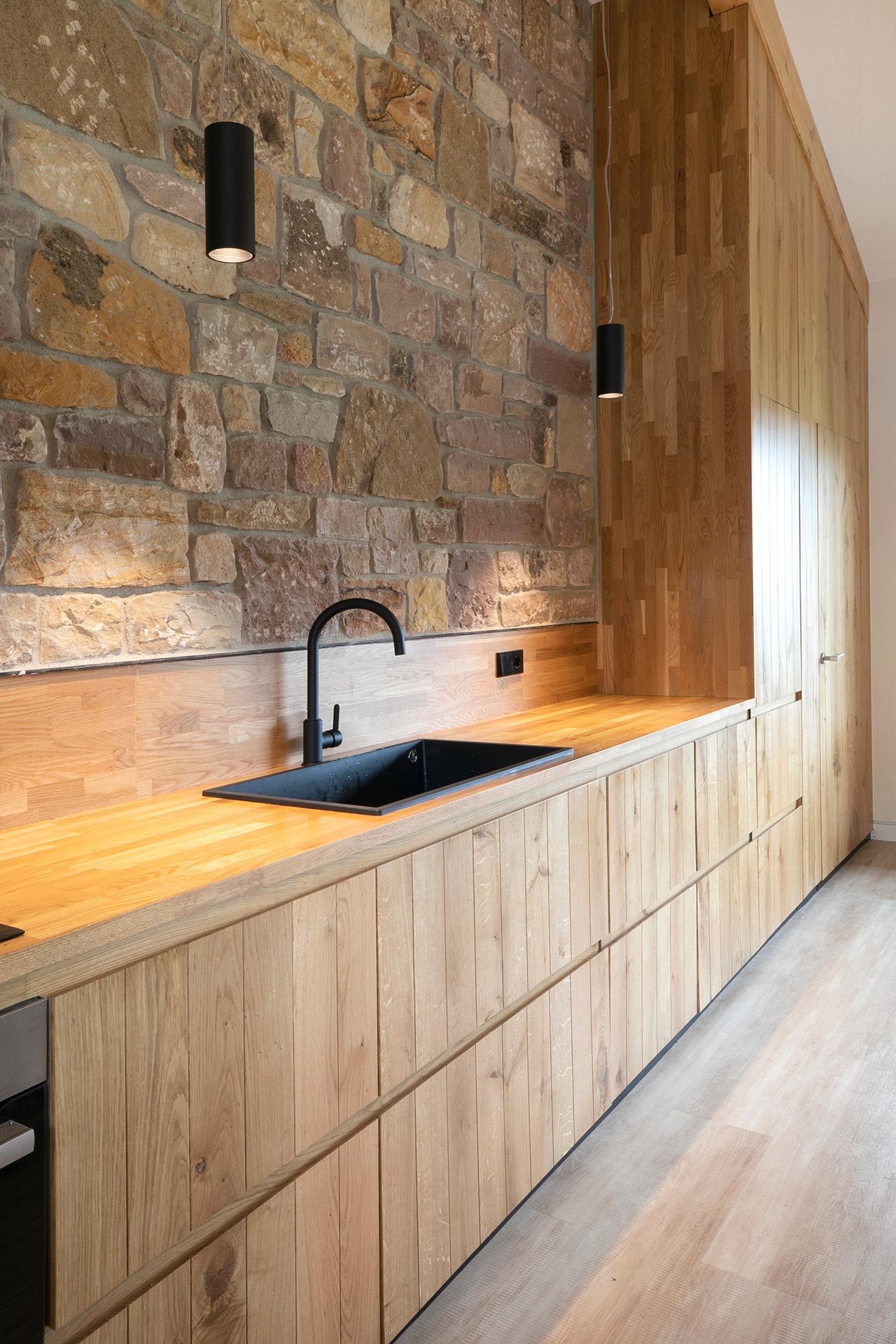 La imagen exterior armoniza con las construcciones locales mediante el empleo de una volumetría sencilla y la utilización de mampostería de piedra caliza de la zona, característica por sus tonos ocres y rosáceos. Esta apariencia rústica sólo se rompe en los huecos de ventanas y poches, que se recercan y singularizan con chapa metálica lacada en negro, insinuando el tratamiento más contemporáneo del interior.