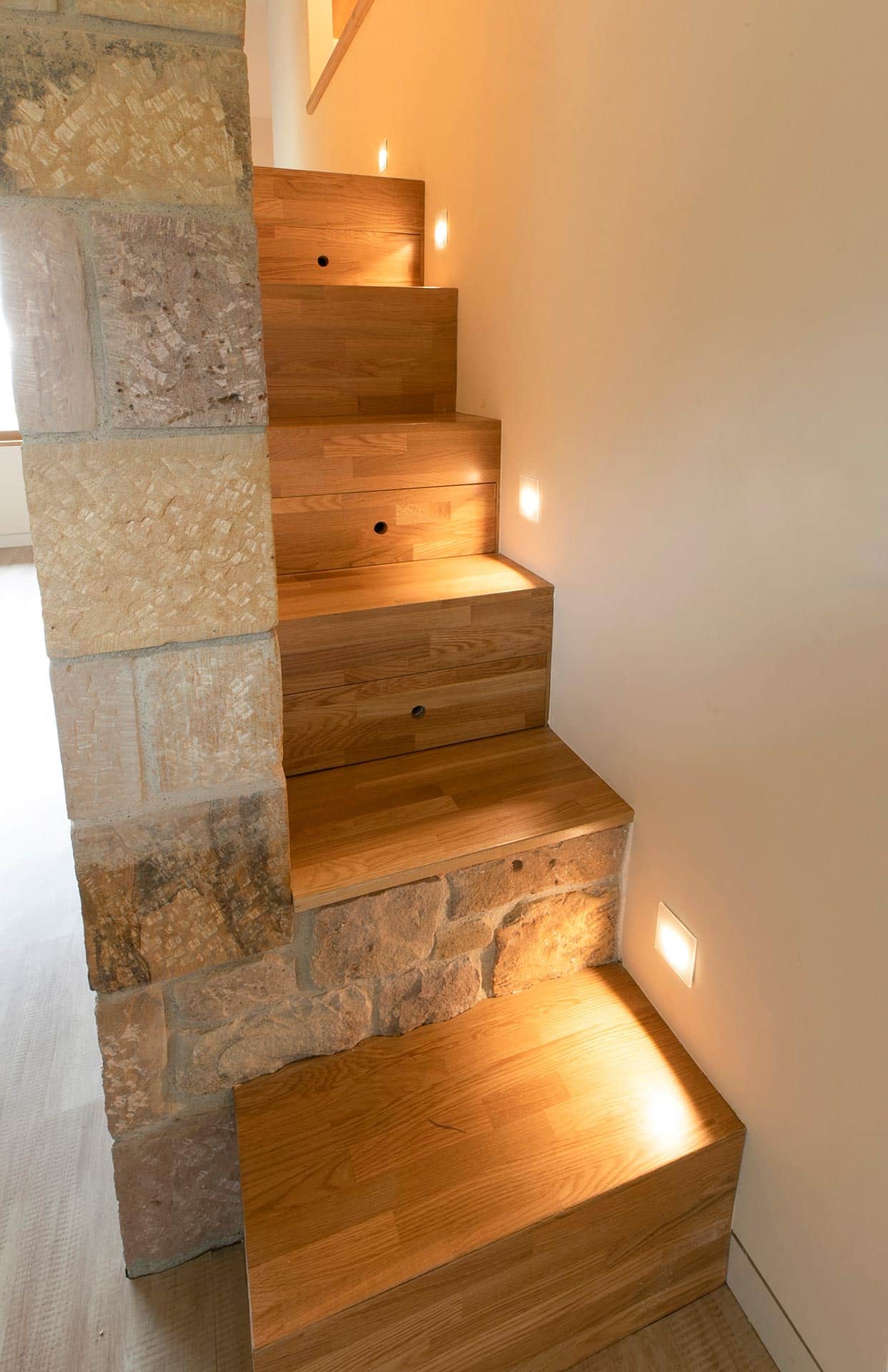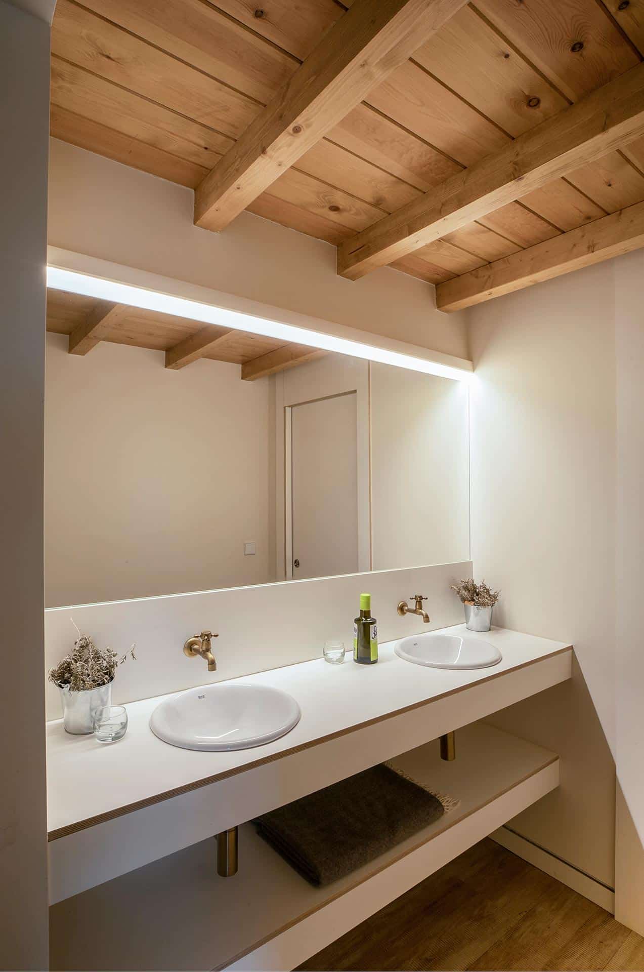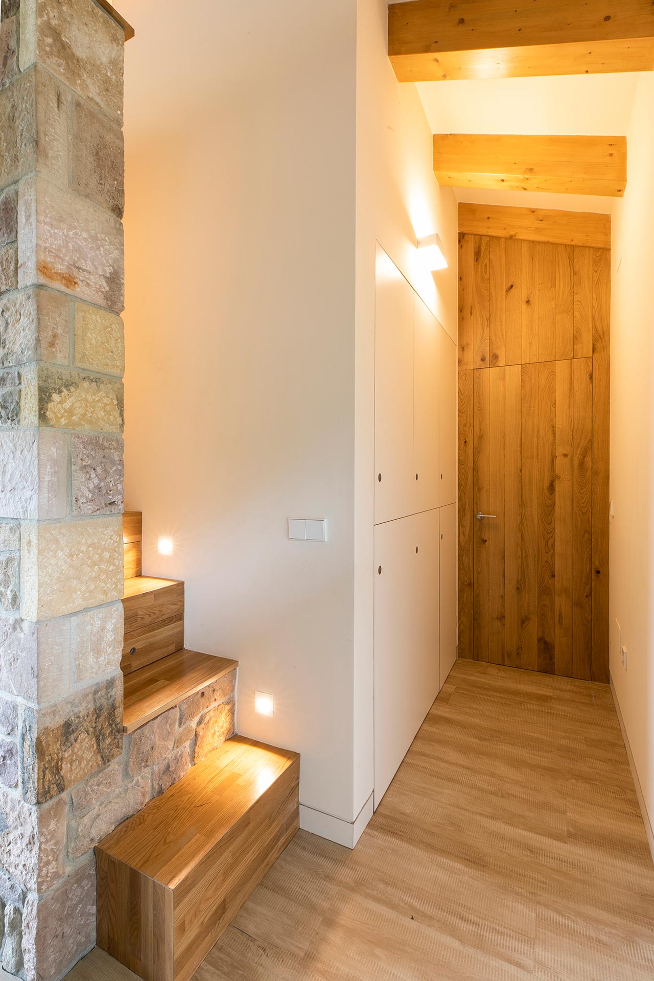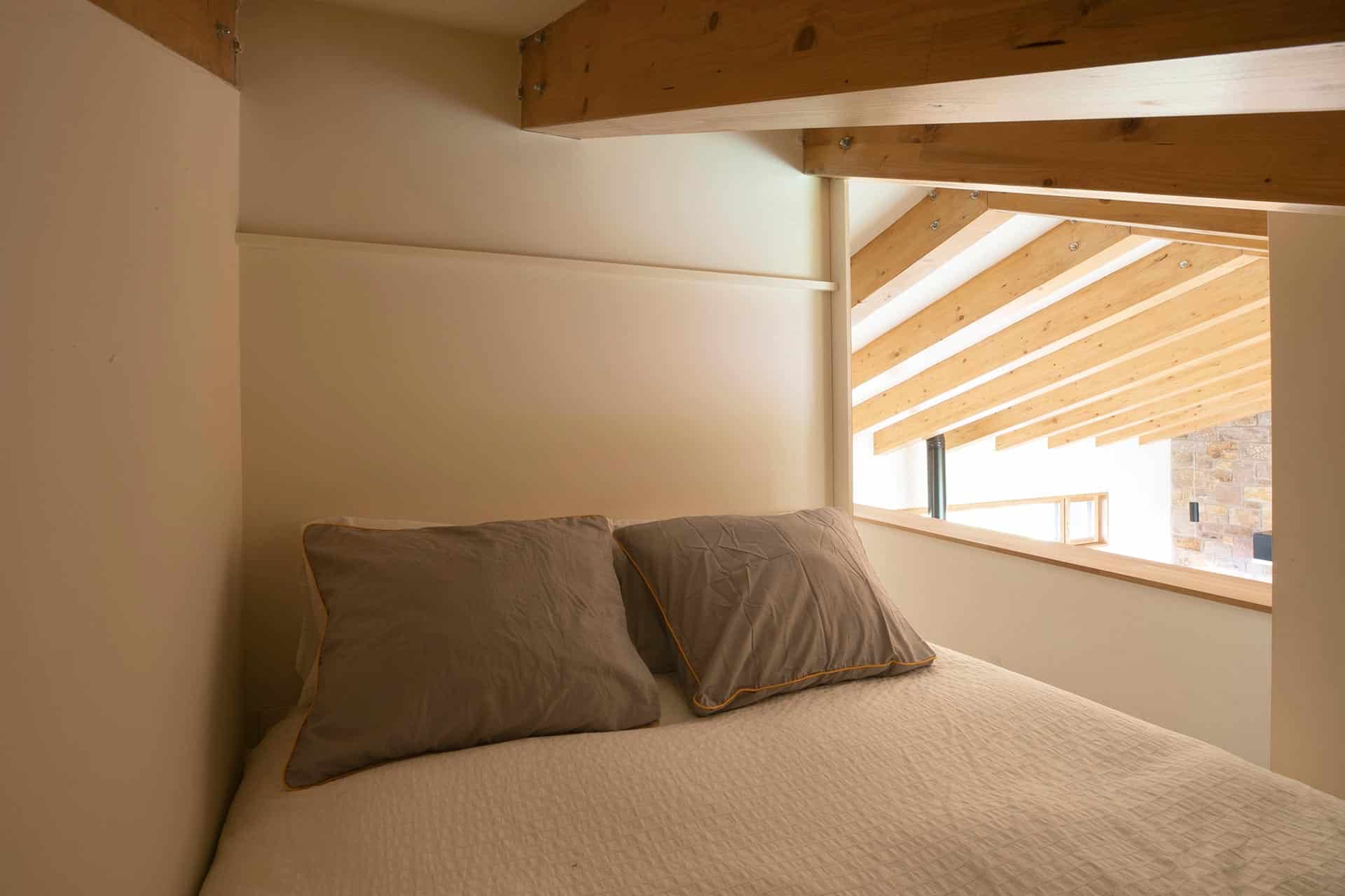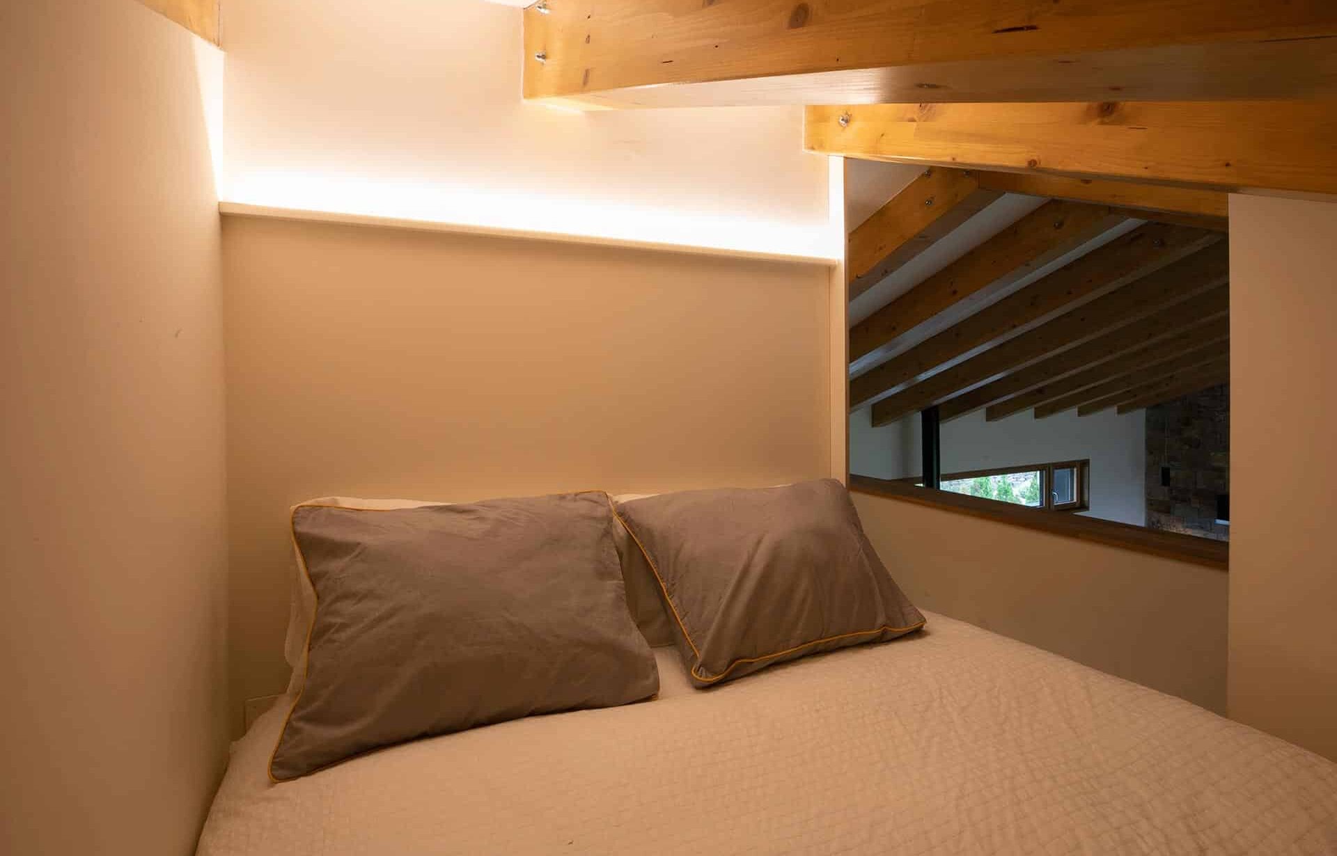 Para maximizar la capacidad de alojamiento se organizan dos dormitorios singulares en un altillo que vuelca a la doble altura del salón. El acceso a ellos se realiza a través de unas escaleras talladas en madera que sirven a su vez de espacio de almacenaje.