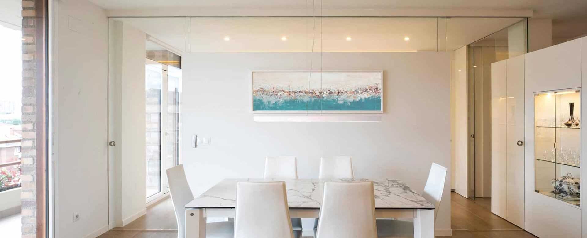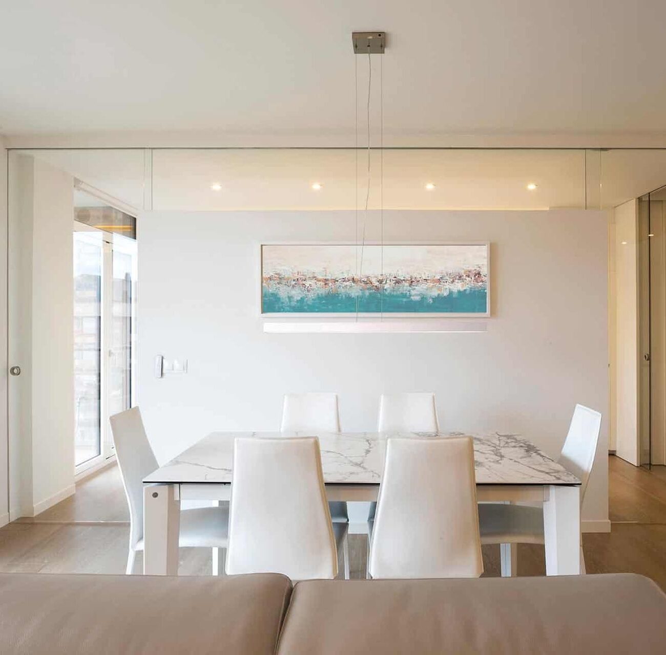 Por otro lado, las vistas, las terrazas y los grandes ventanales que posee la vivienda a sur, hace que se plantee el espacio de relación de salón-comedor-cocina hacia dicha orientación, cambiando la ubicación originaria de la cocina y dejando las estancias más privadas, dormitorios, baños y estudio, hacia norte. La cocina se relaciona con el salón-comedor mediante cristaleras que dejan pasar la luz y amplian el espacio, pero sin establecer una visión directa con la cocina.