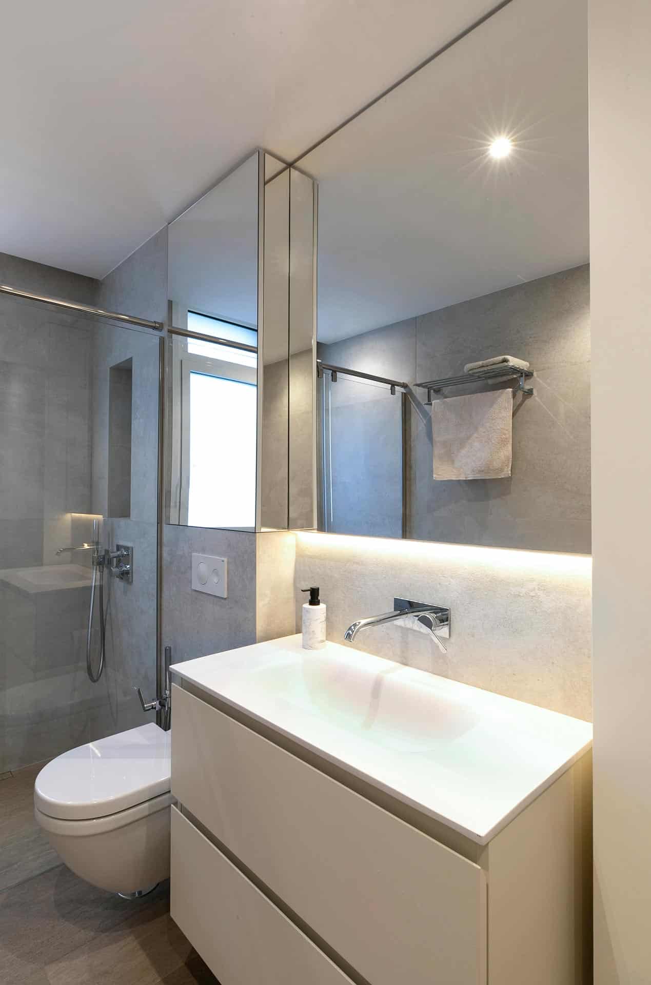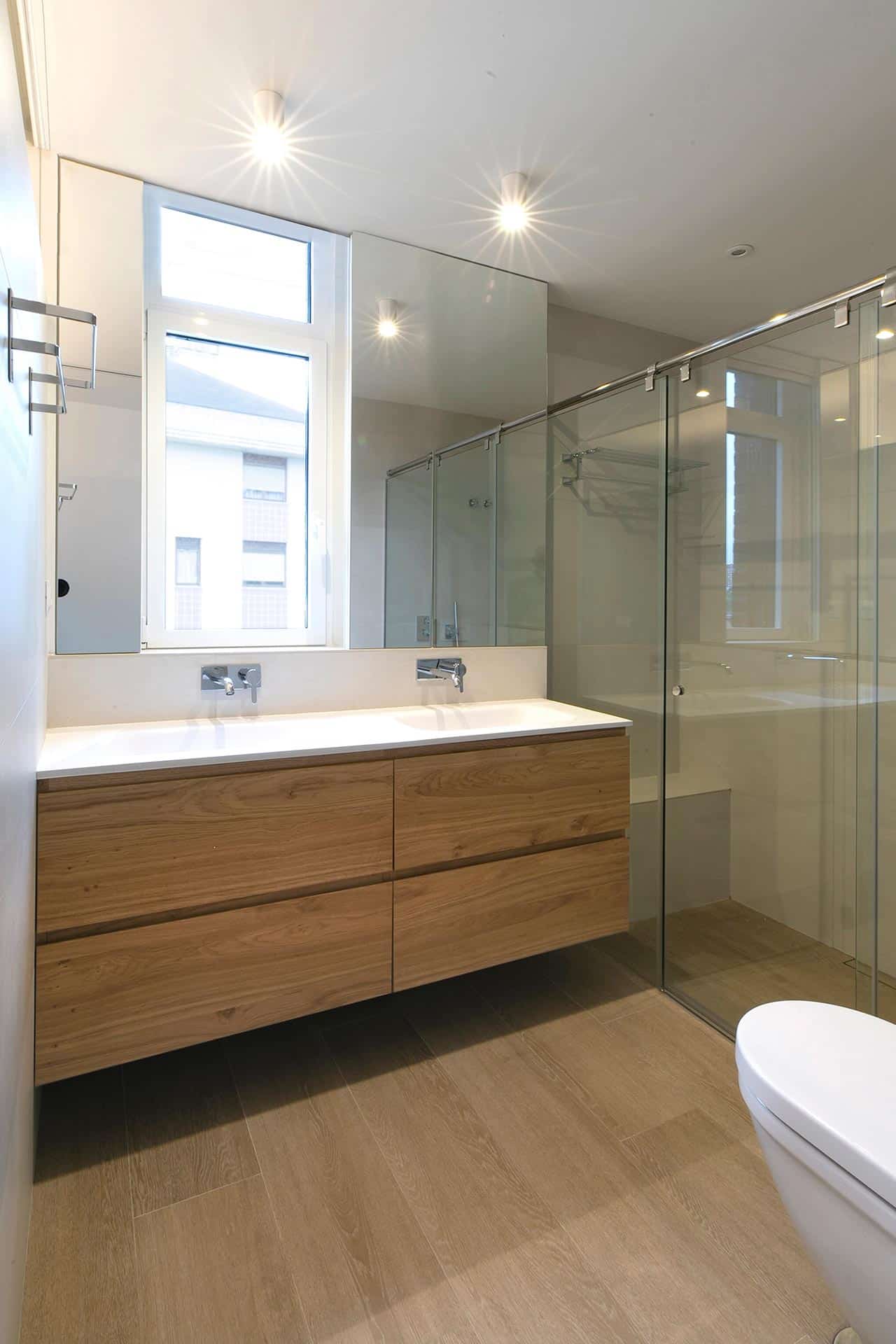 Uno de los requerimientos al afontar la reforma es conseguir mucha superficie de almacenaje, lo que se logra con el diseño de mobiliario a medida en todas las estancias incluso en baños, en los que los espejos albergan armarios ocultos.