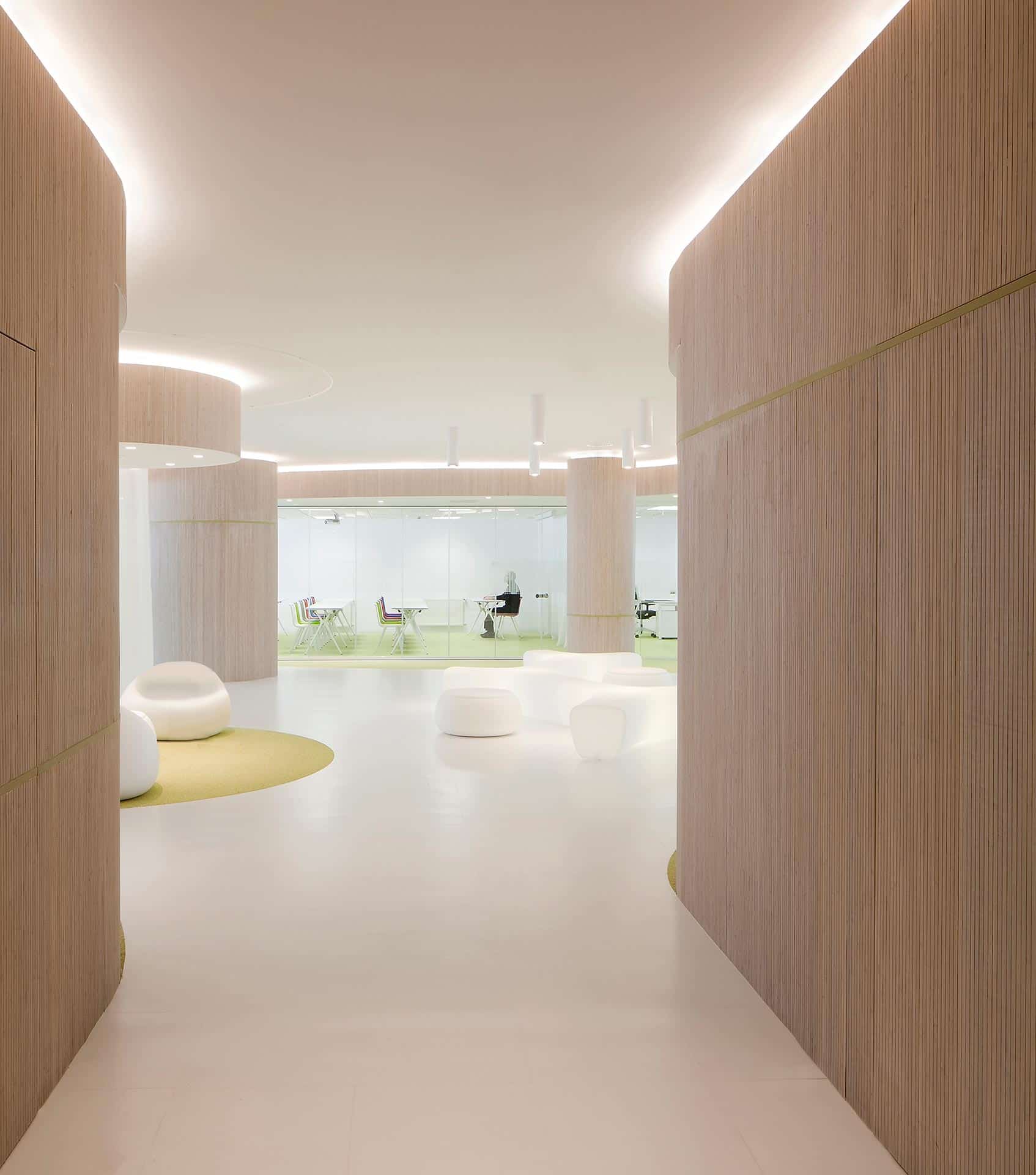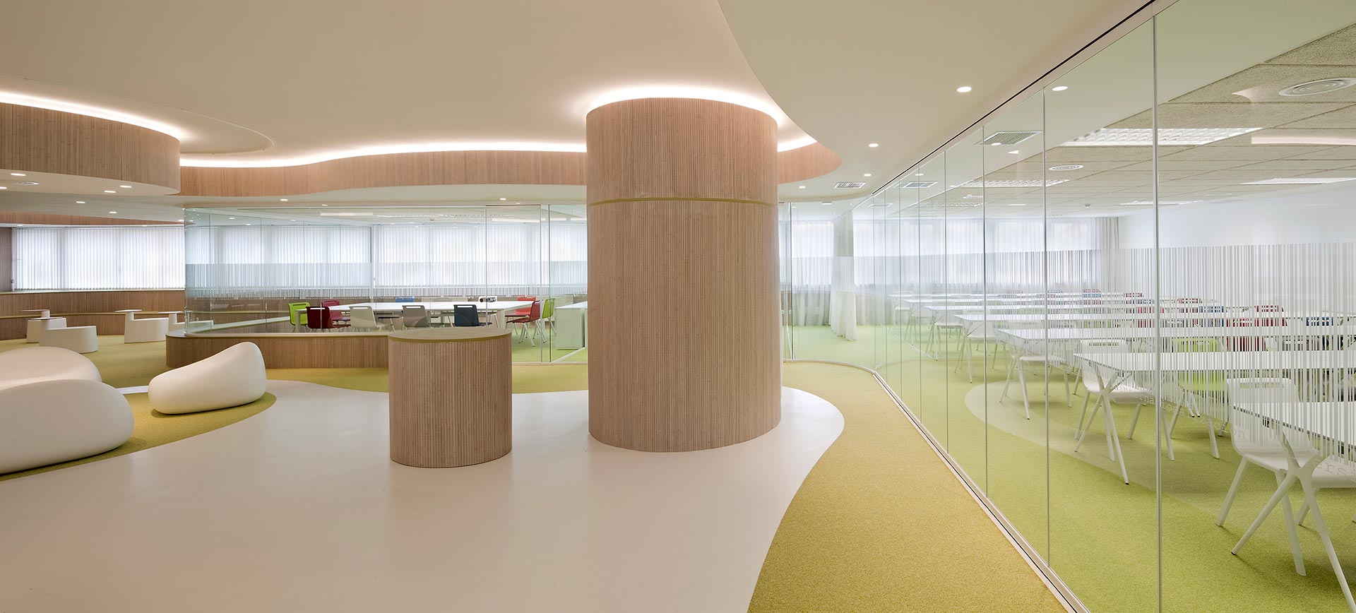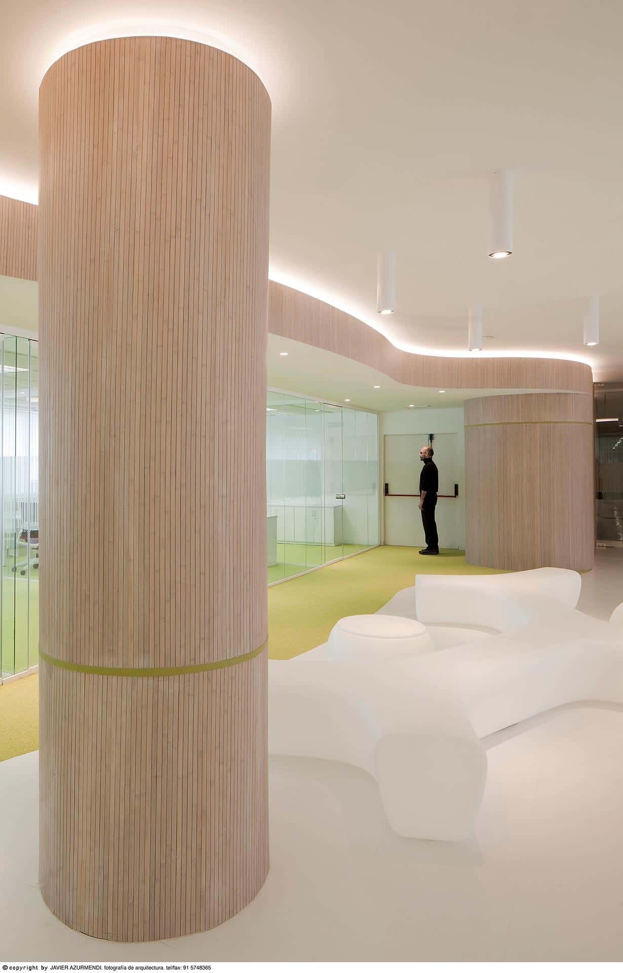 La distribución se organiza a través de un gran vestíbulo central que sirve como espacio de recibimiento, relación y reunión. Este ágora es permeable a los distintos espacios de trabajo que se desarrollan en torno a ella, rompiendo con el concepto de tabiquería. La compartimentación de espacios y usos se hace con elementos ligeros de vidrio, textiles o de mobiliario, así como a través de una sutil variación de niveles en el techo.