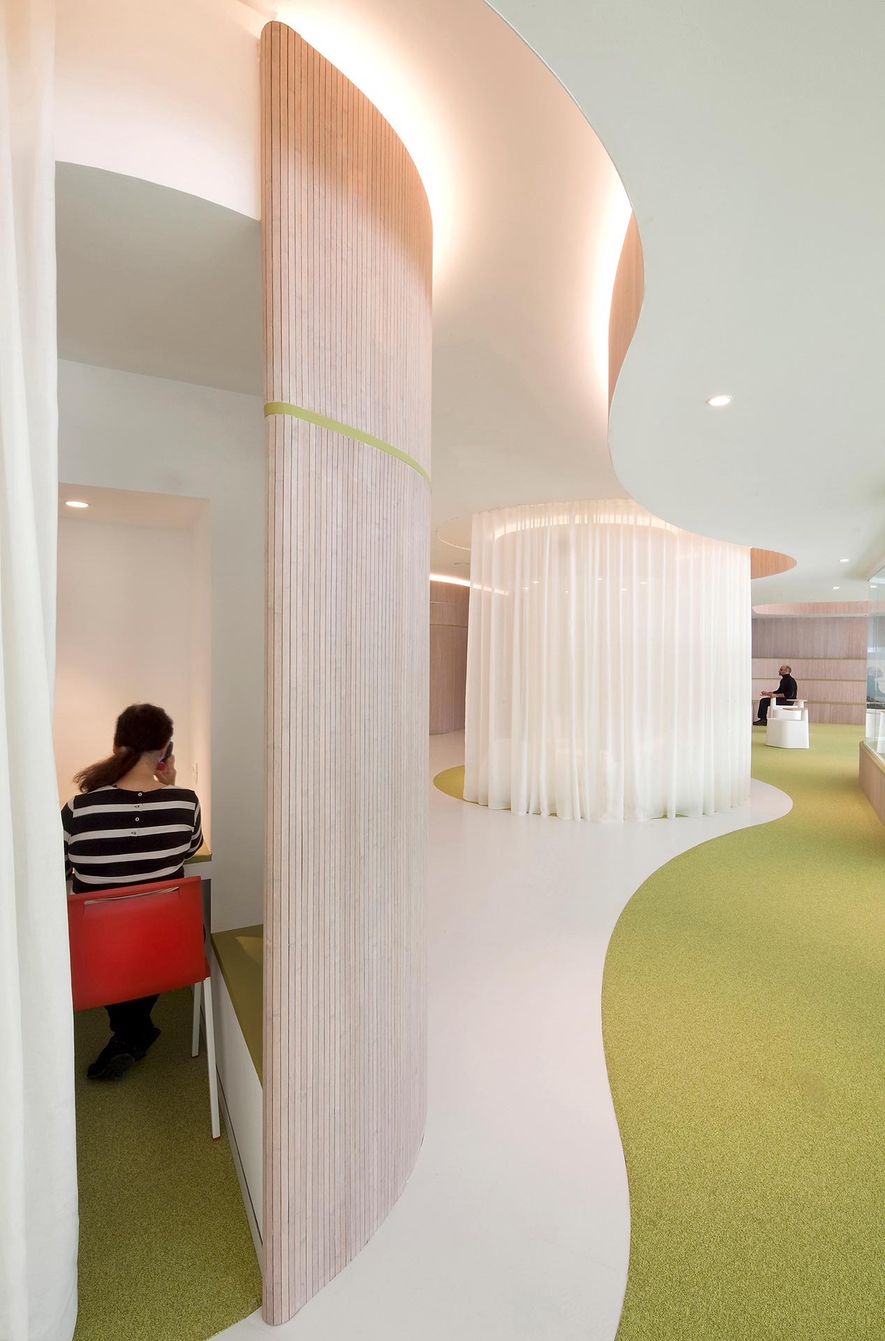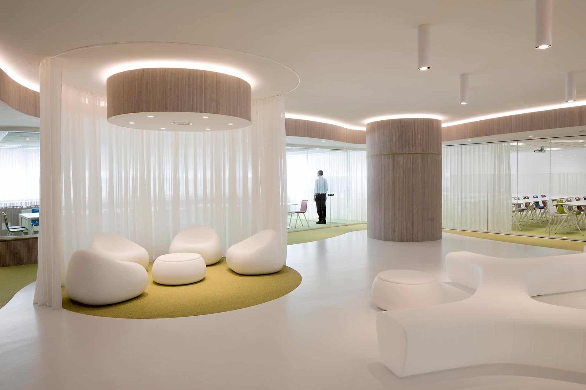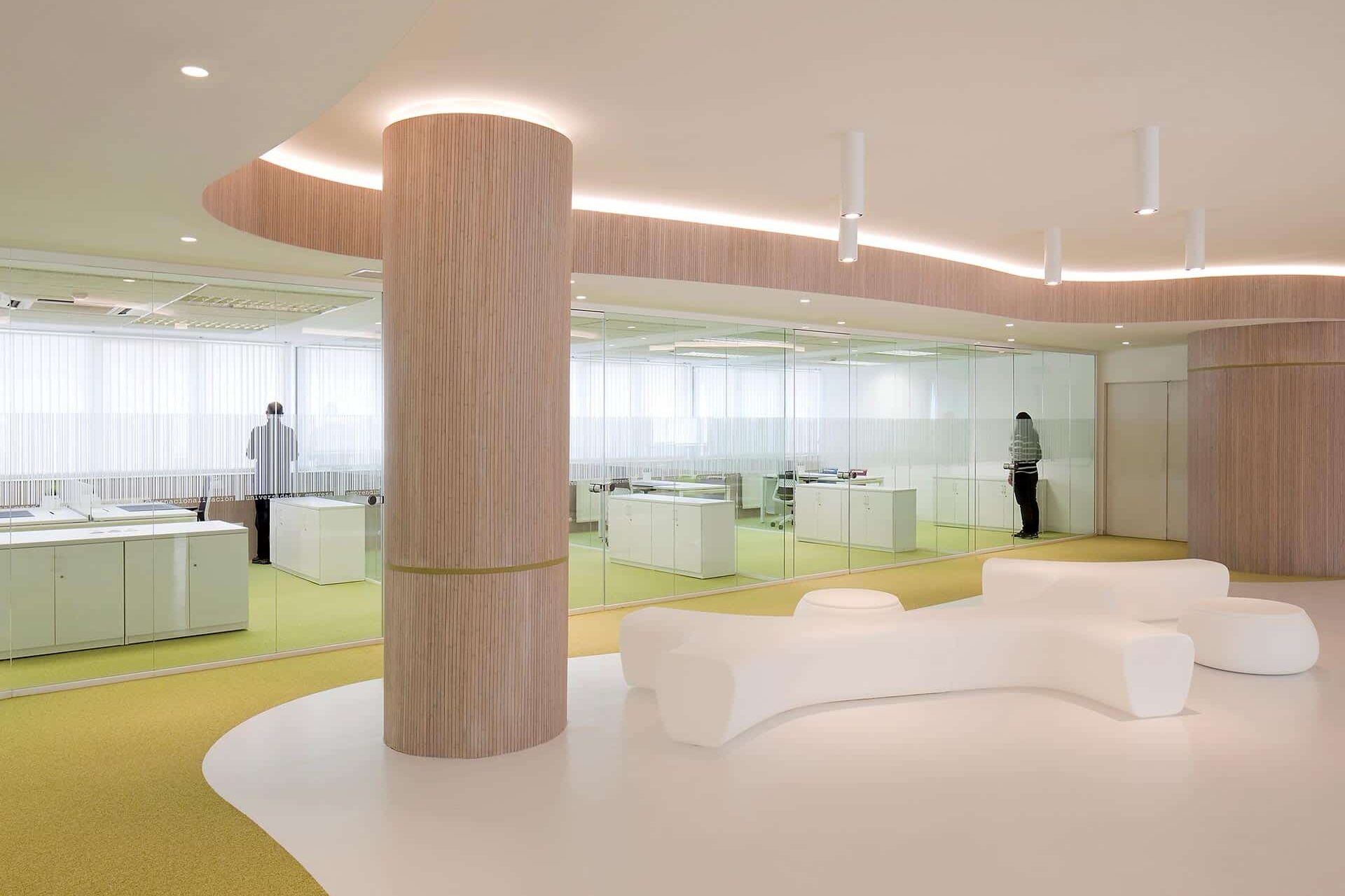 La distribución se organiza a través de un gran vestíbulo central que sirve como espacio de recibimiento, relación y reunión. Este ágora es permeable a los distintos espacios de trabajo que se desarrollan en torno a ella, rompiendo con el concepto de tabiquería. La compartimentación de espacios y usos se hace con elementos ligeros de vidrio, textiles o de mobiliario, así como a través de una sutil variación de niveles en el techo.