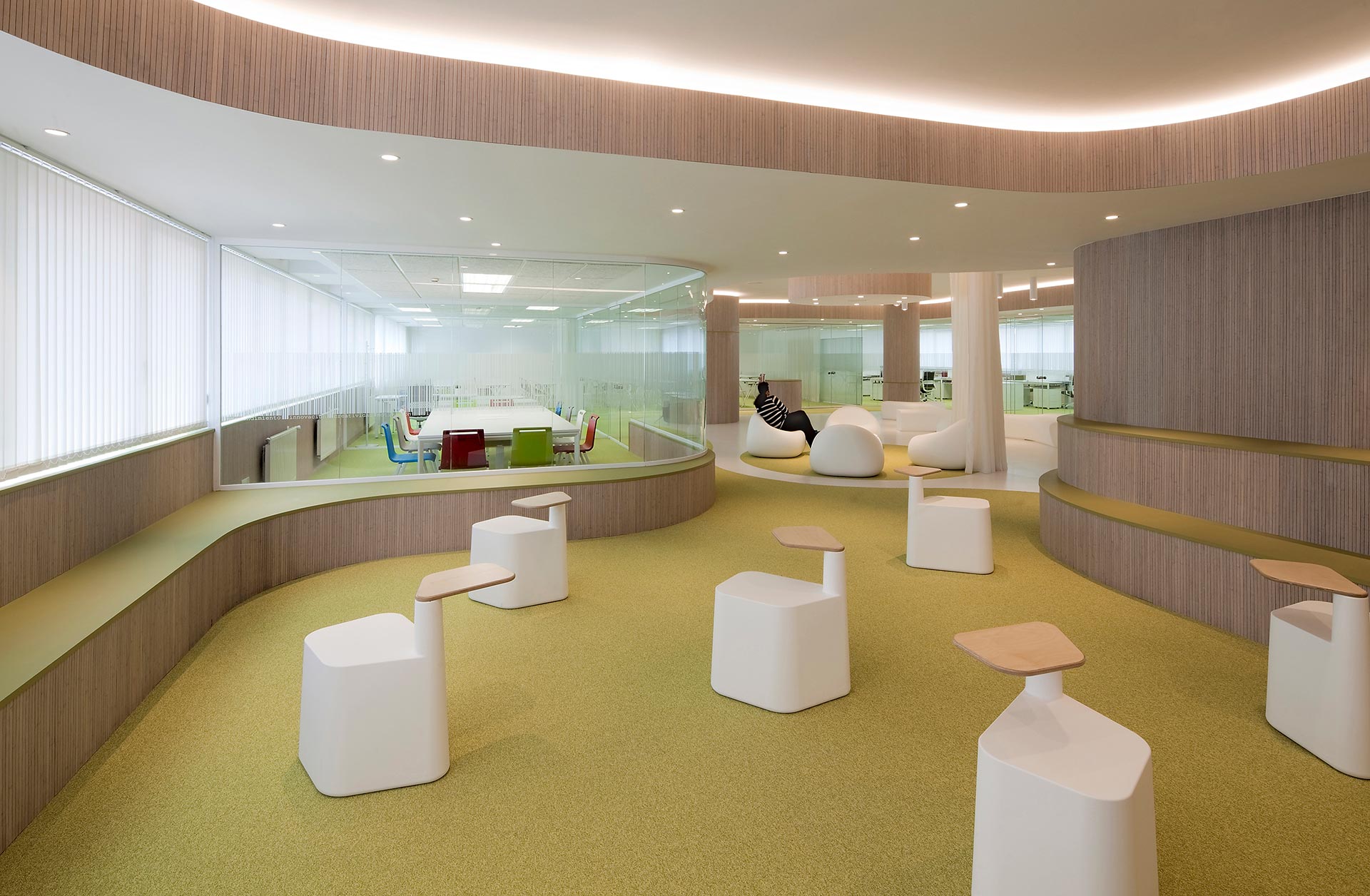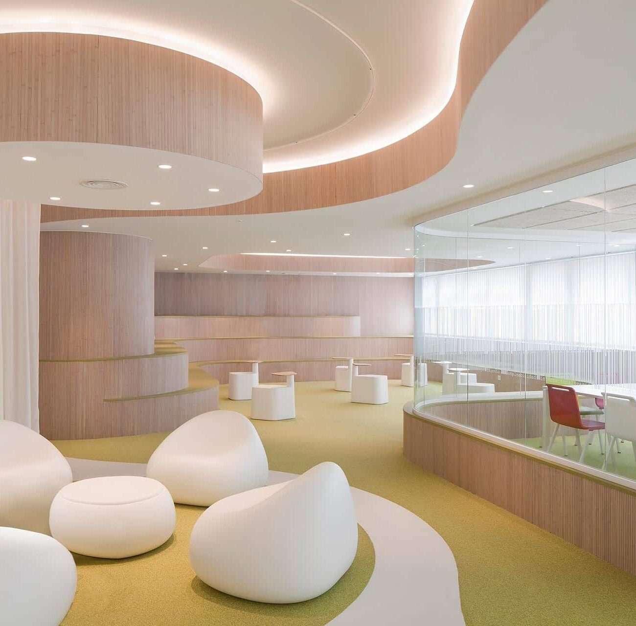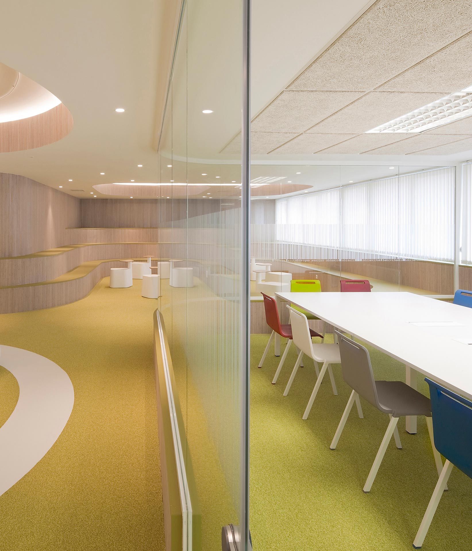 El mobiliario y equipamiento se realiza con elementos móviles, plegables y adaptables que permiten la libre organización de los espacios para adaptarse a distintos formatos de utilización. En las salas de trabajo, la paleta cromática se enriquece con colores vivos para crear un ambiente optimista y desenfadado.