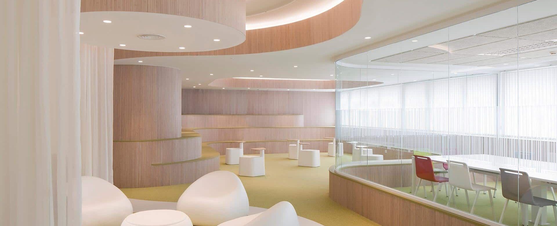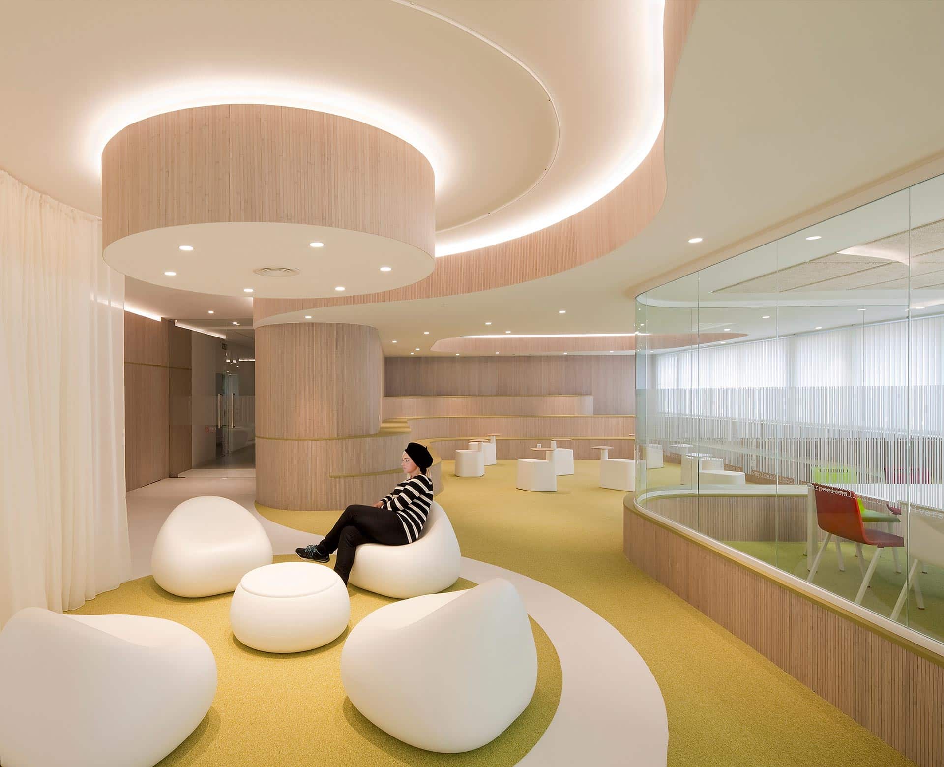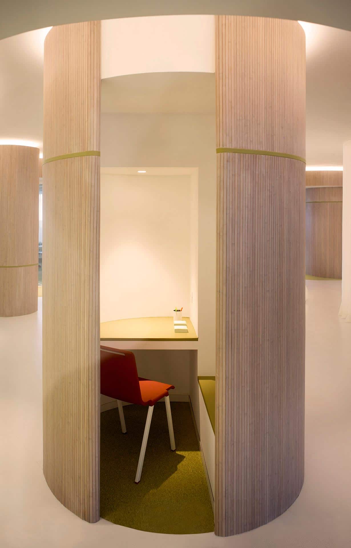 El mobiliario y equipamiento se realiza con elementos móviles, plegables y adaptables que permiten la libre organización de los espacios para adaptarse a distintos formatos de utilización. En las salas de trabajo, la paleta cromática se enriquece con colores vivos para crear un ambiente optimista y desenfadado.