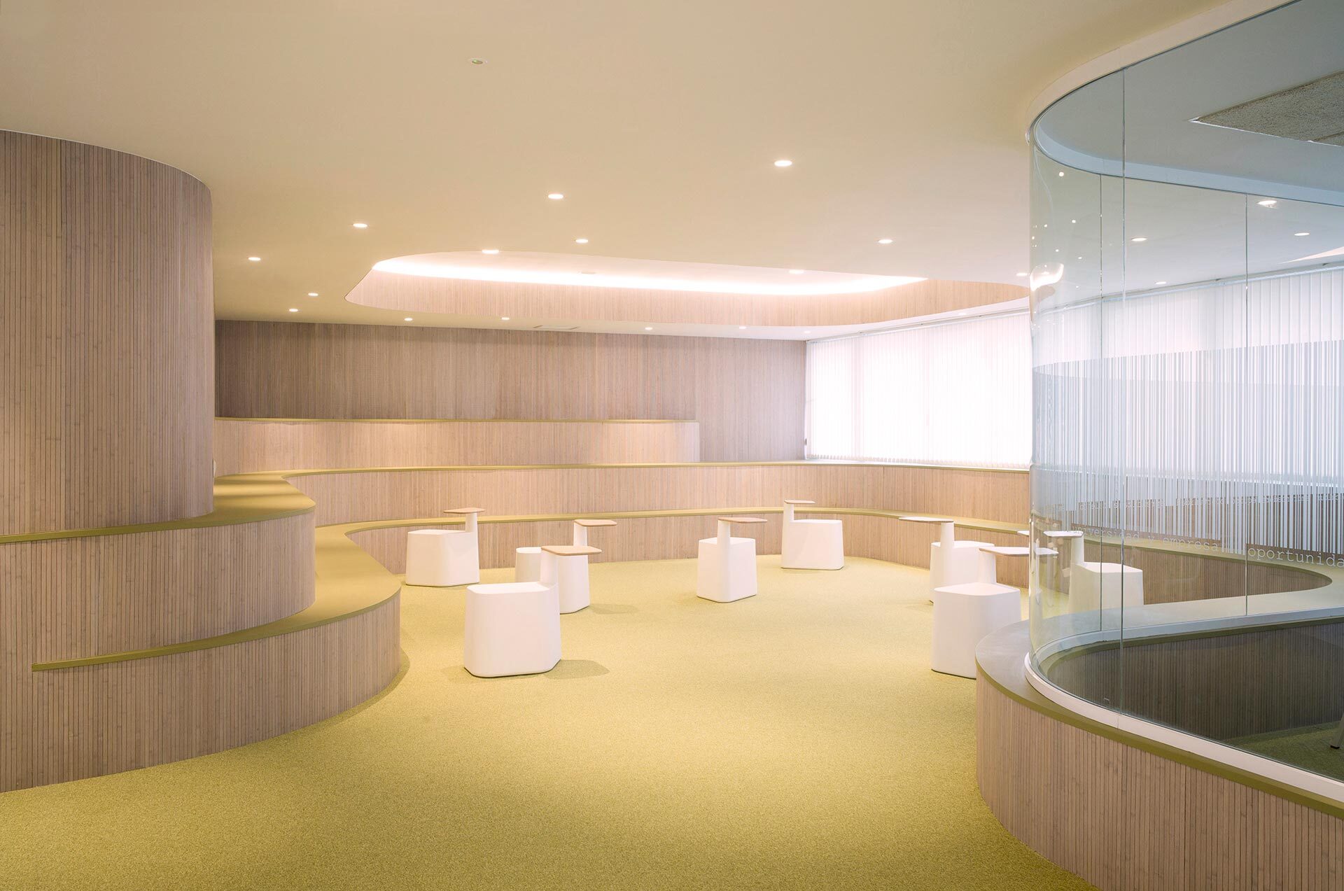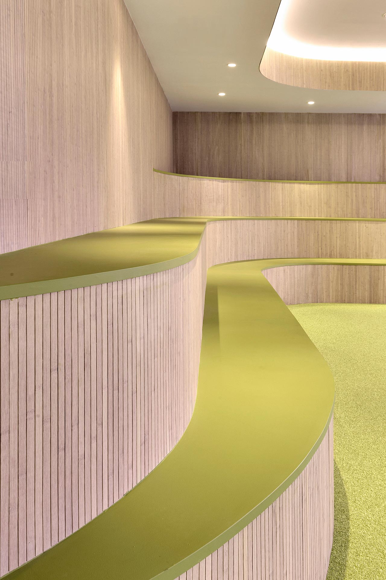 Se crea una naturaleza interior amable y sugerente mediante un juego de líneas curvas y sinuosas de bambú, que envuelven y organizan los distintos ambientes. Las líneas de bambú recorren el espacio transformándose en petos, gradas, pilares, fosas... La geometría orgánica se traslada también a pavimentos y mobiliario, dotando a los espacios de fluidez y dinamismo.