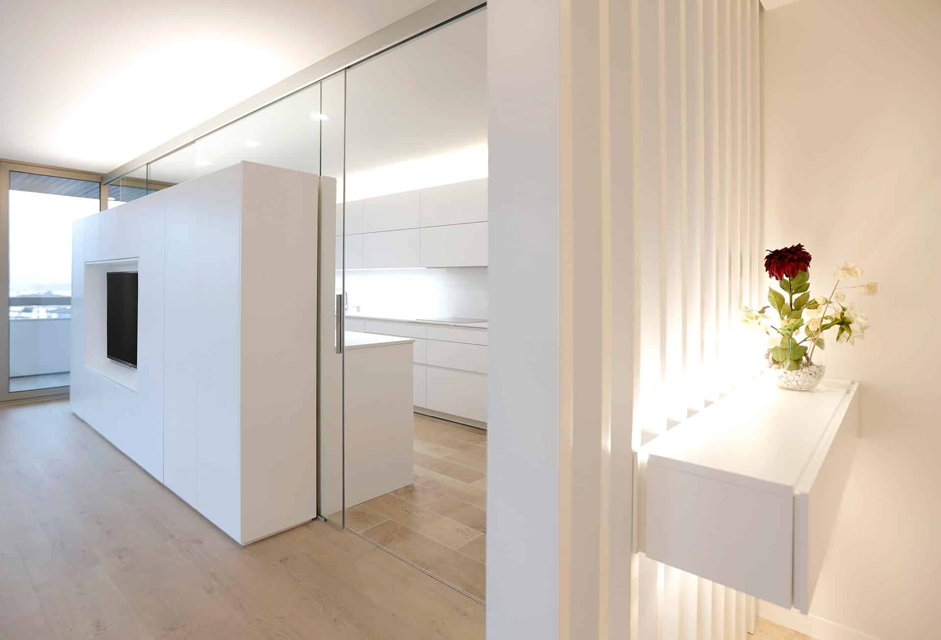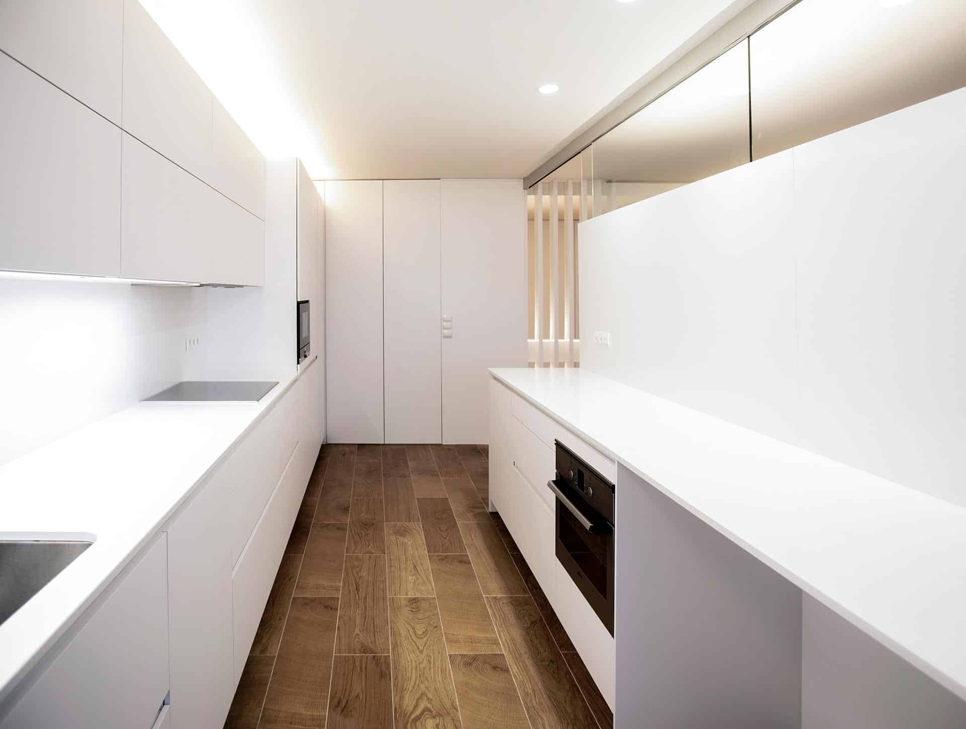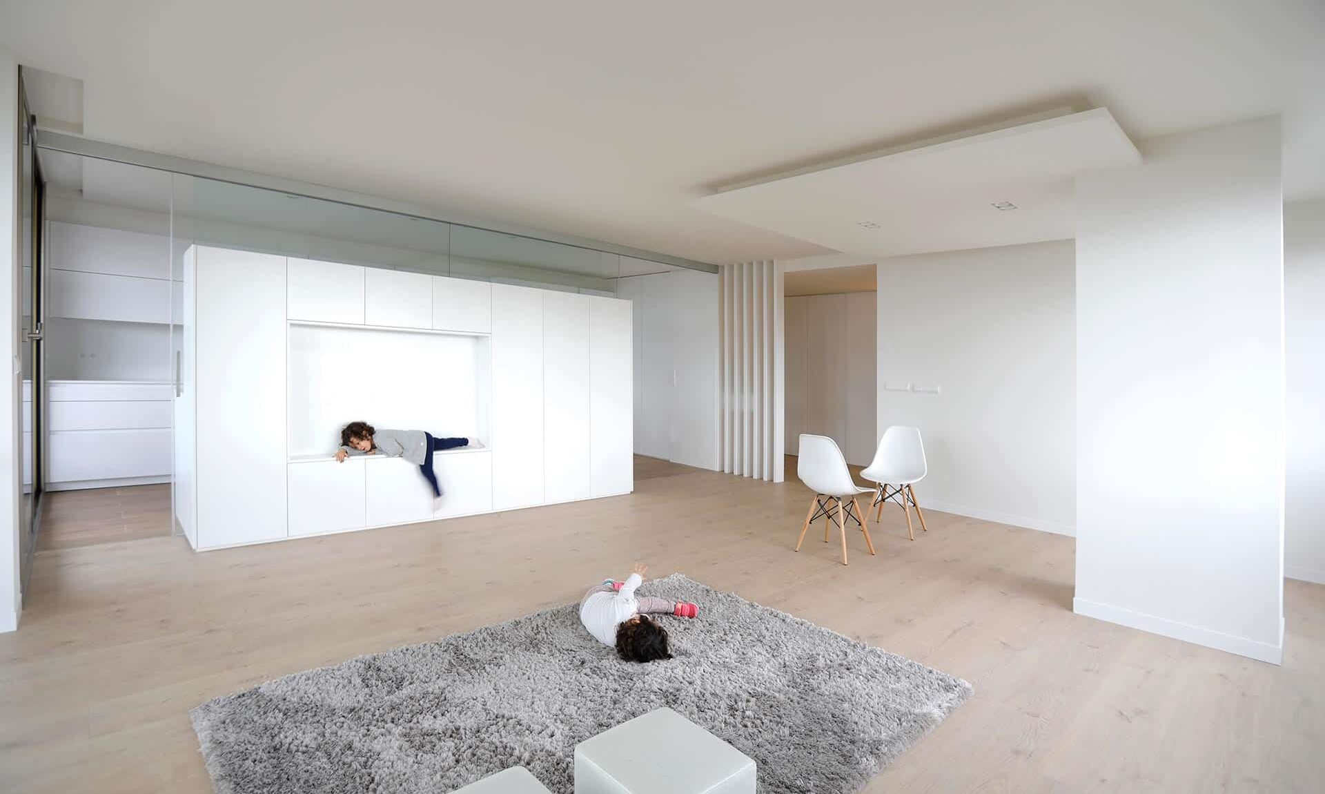 En la reforma, se distribuye por completo la vivienda, orientando salón, comedor y cocina hacia las vistas y la terraza sur. Salón y cocina quedan relacionados de forma semipermeable a través de un mueble que compartimenta el espacio y da servicio a ambos espacios. La cocina cuenta con la posibilidad de independizarse de ruidos y olores mediante grandes correderas de vidrio. El diseño interior limpio y minimalista, presidido por el blanco de paredes y mobiliario, confiere una atmósfera sosegada.