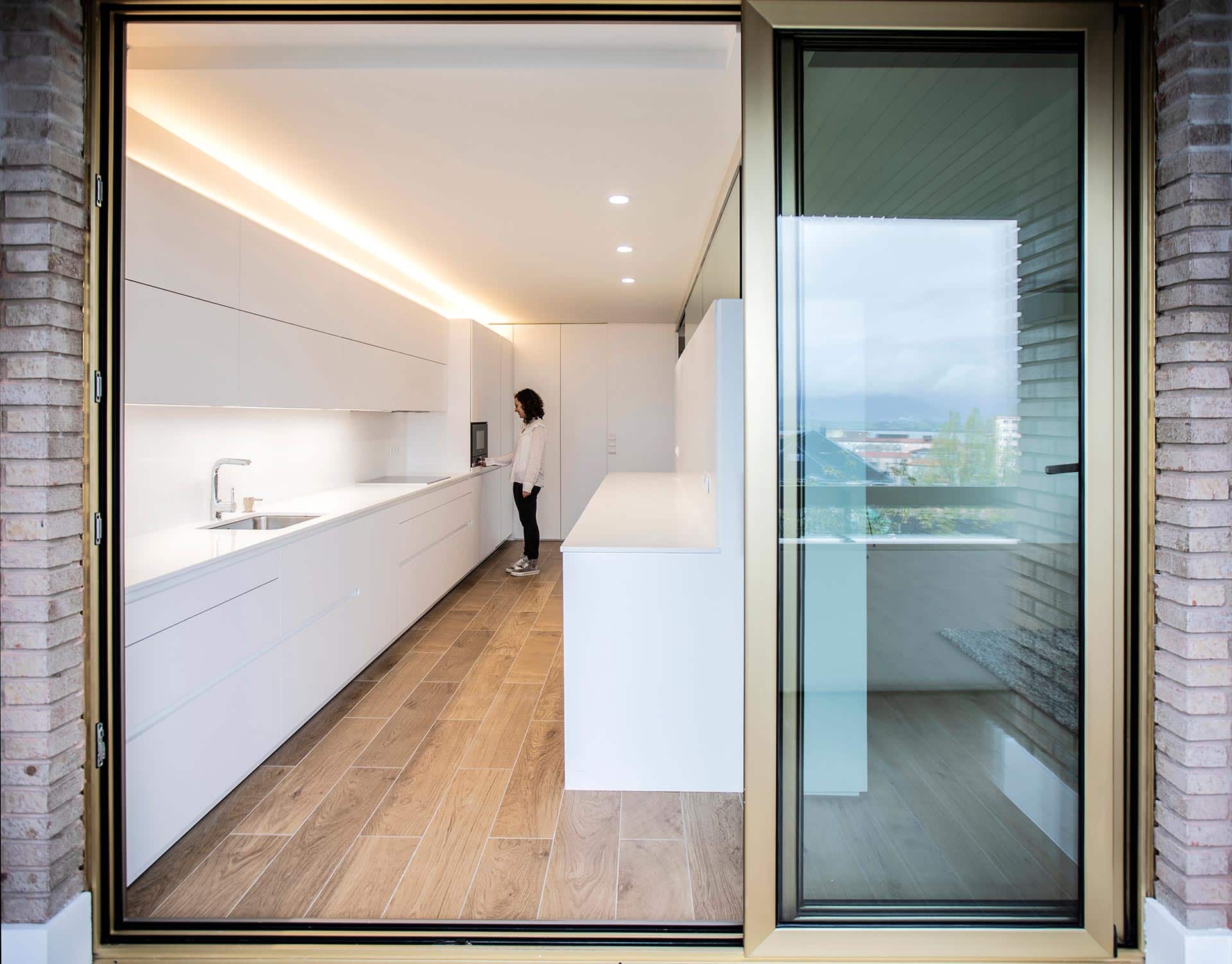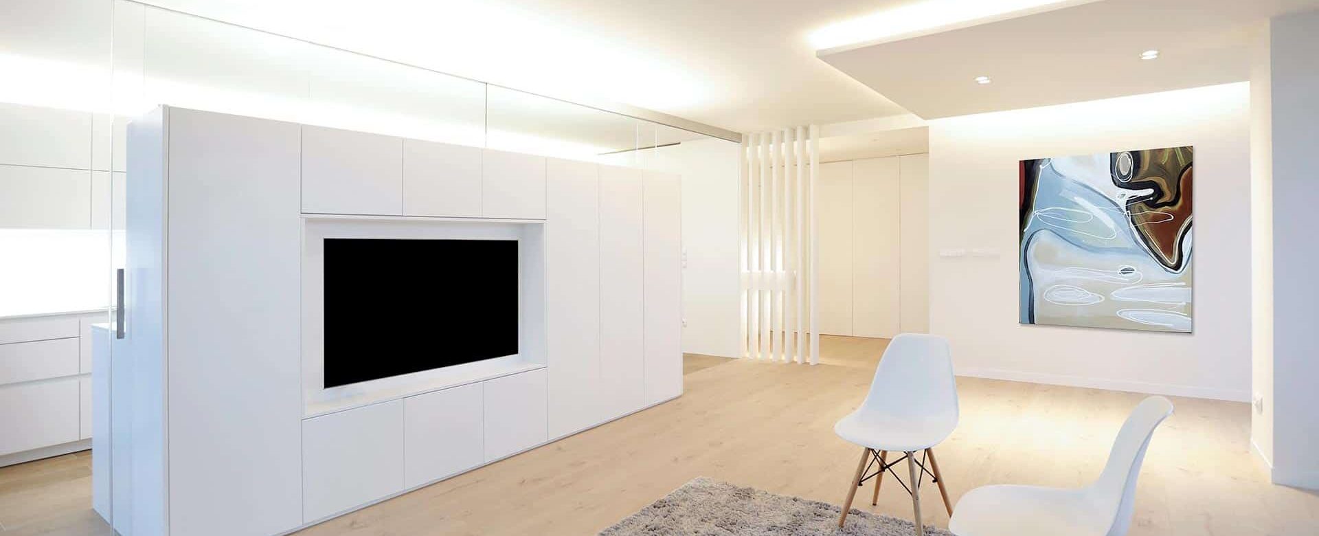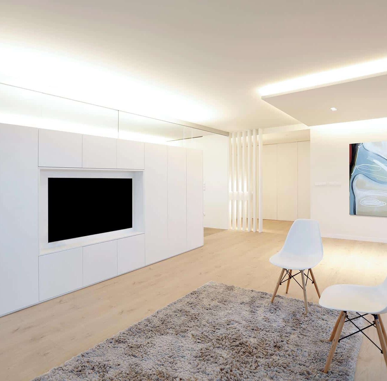 En la reforma, se distribuye por completo la vivienda, orientando salón, comedor y cocina hacia las vistas y la terraza sur. Salón y cocina quedan relacionados de forma semipermeable a través de un mueble que compartimenta el espacio y da servicio a ambos espacios. La cocina cuenta con la posibilidad de independizarse de ruidos y olores mediante grandes correderas de vidrio. El diseño interior limpio y minimalista, presidido por el blanco de paredes y mobiliario, confiere una atmósfera sosegada.