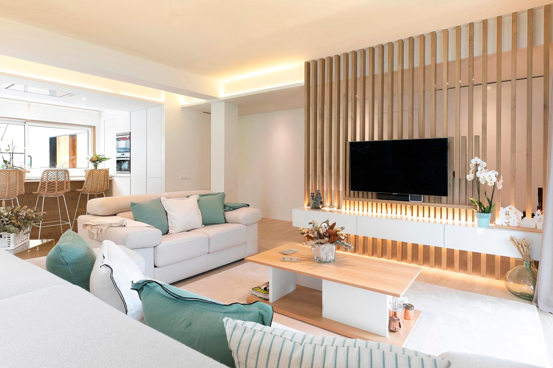 La imagen exterior mantiene el carácter original de la vivienda, combinando respetuosamente los tres materiales predominantes: piedra caliza, mortero pintado y madera. En el interior se combina un fondo blanco minimalista con el empleo de madera de roble en suelos y mobiliario que le otorga calidez. En complementos y textiles se utiliza un turquesa pastel que armoniza con las plantas de interior y la omnipresente vegetación exterior. En la iluminación se da preferencia a luces indirectas que se integran en lamas, foseados y muebles.