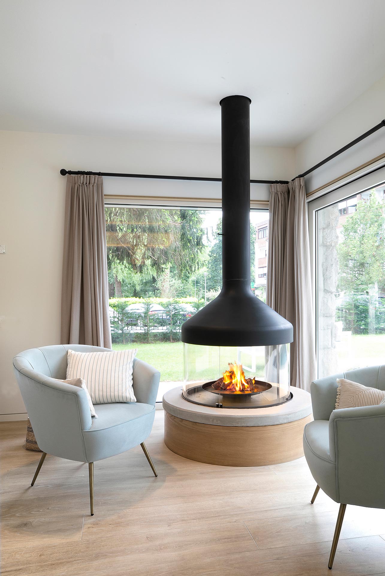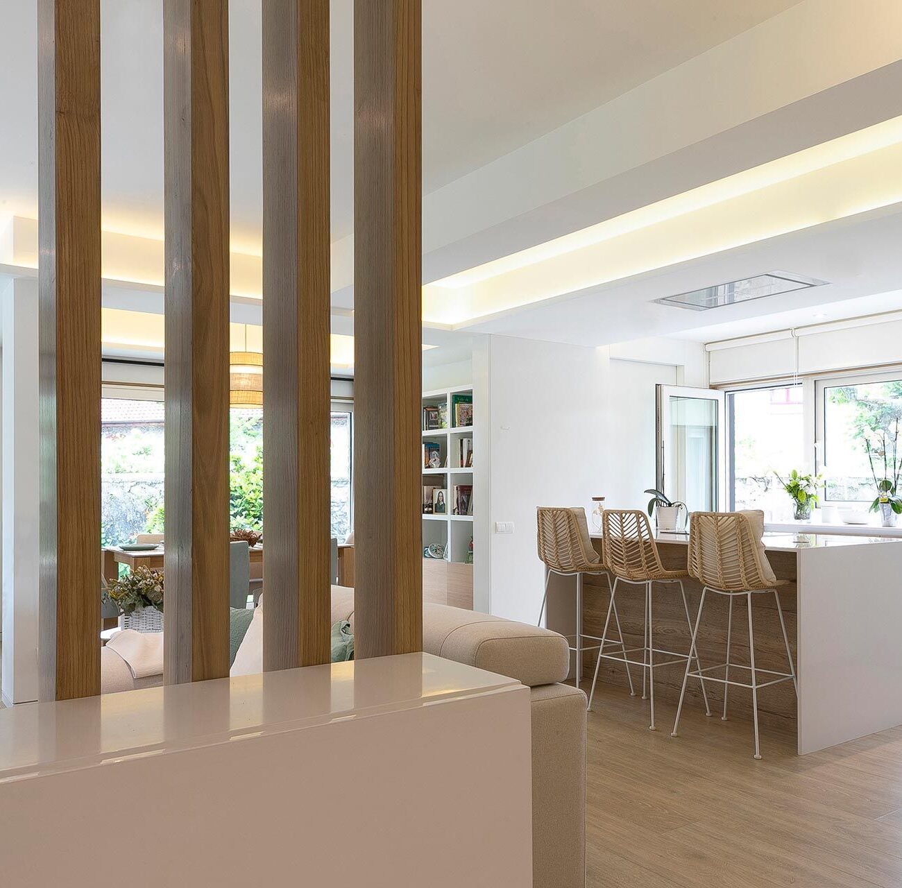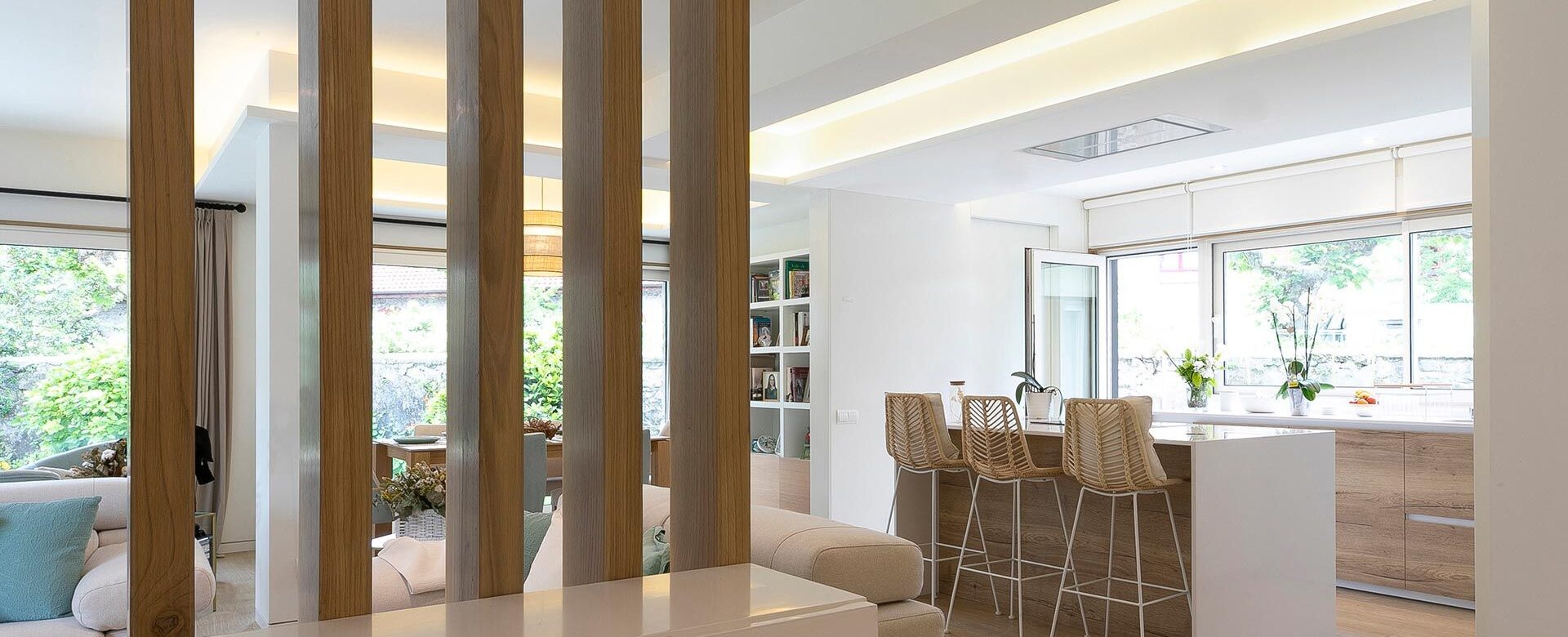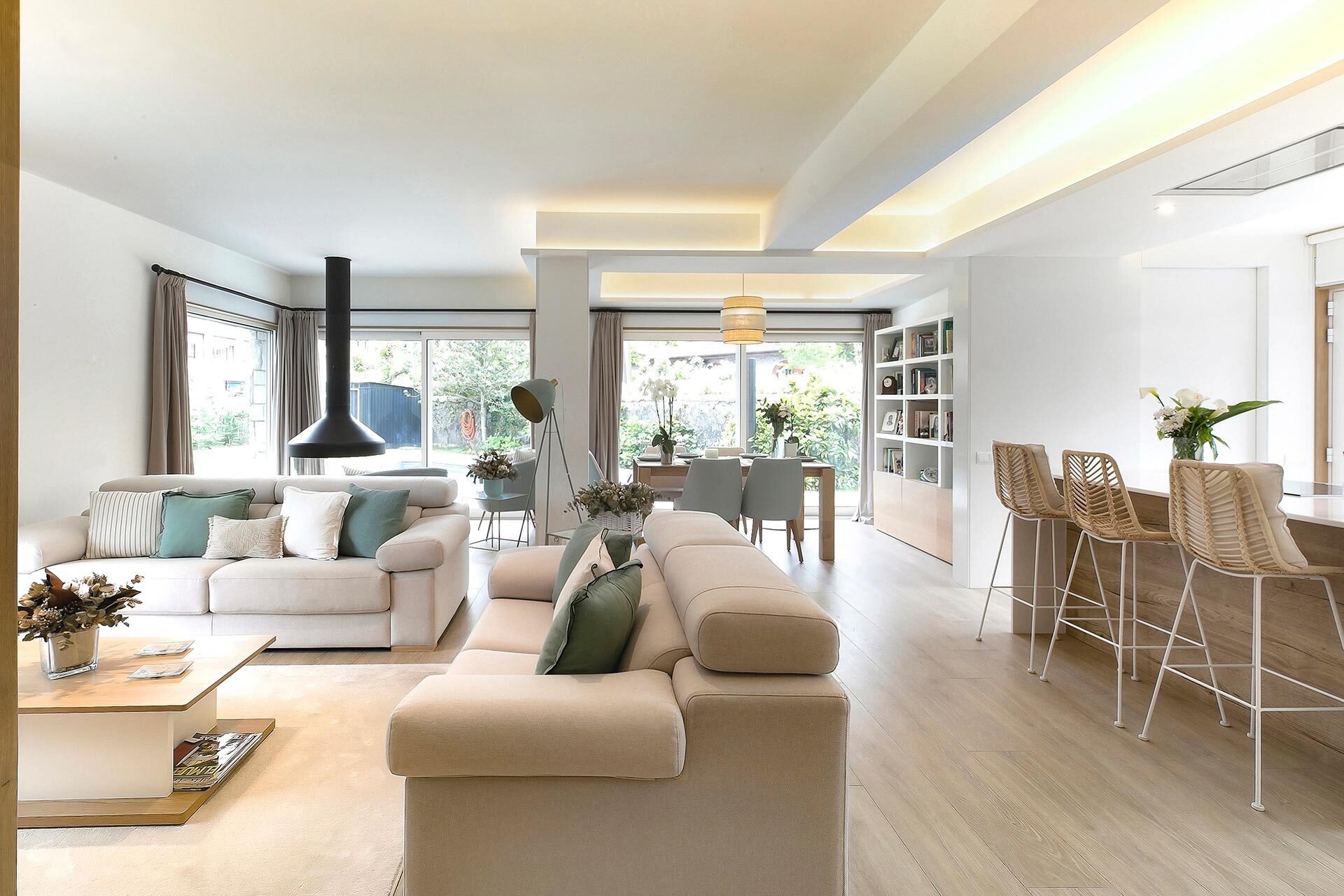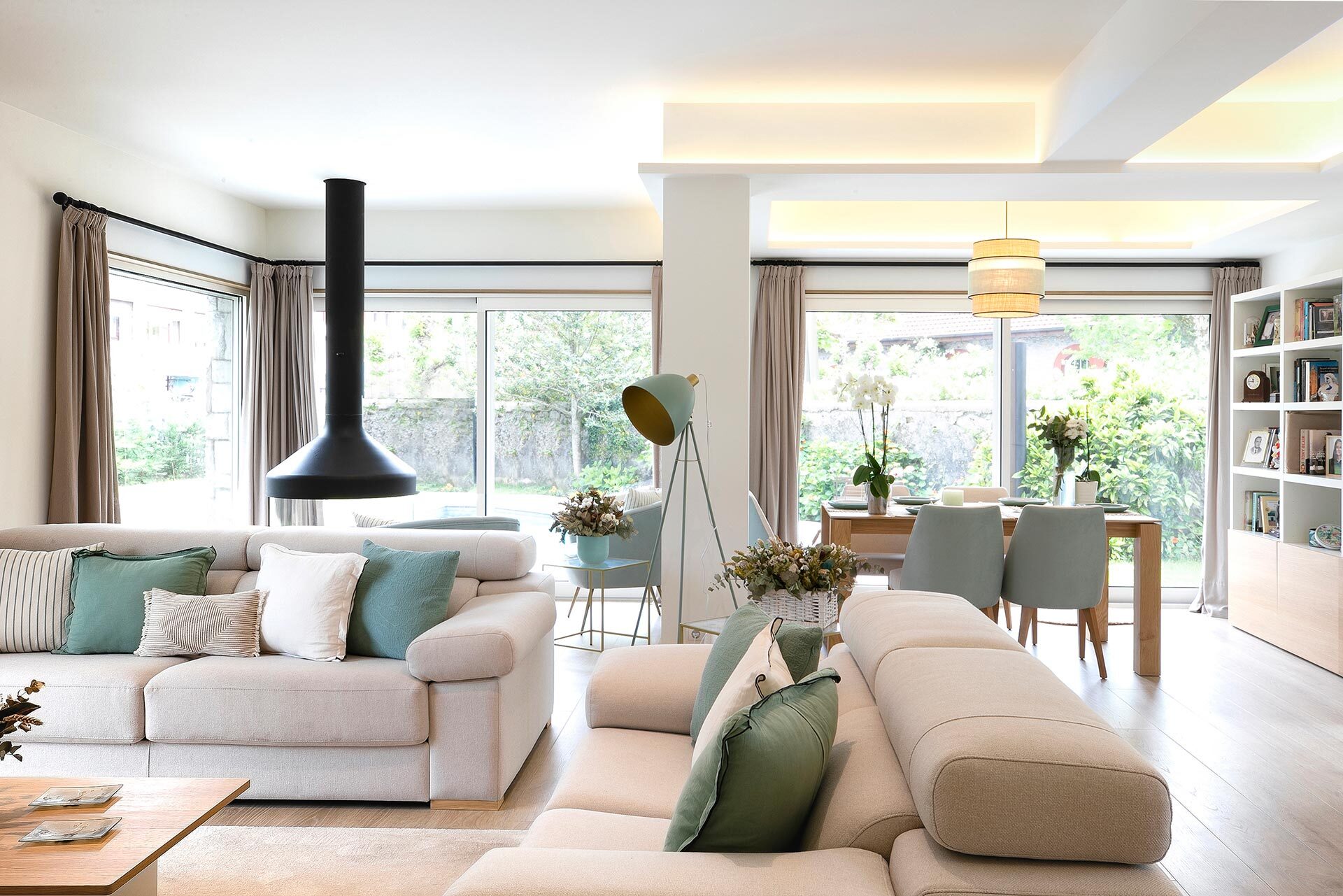 Una de las principales intenciones era crear una casa muy permeable al jardín que plantease un uso muy directo del espacio exterior. Esto permitiría además introducir la vegetación en el interior y potenciar la sensación de amplitud. Para ello se crea un espacio único de salón-cocina-comedor en el que se abren grandes ventanales a las principales orientaciones. Las cristaleras dilatan el espacio incorporando los porches y terrazas exteriores. Este espacio multiuso se divide en distintos ambientes mediante el mobiliario y la iluminación.