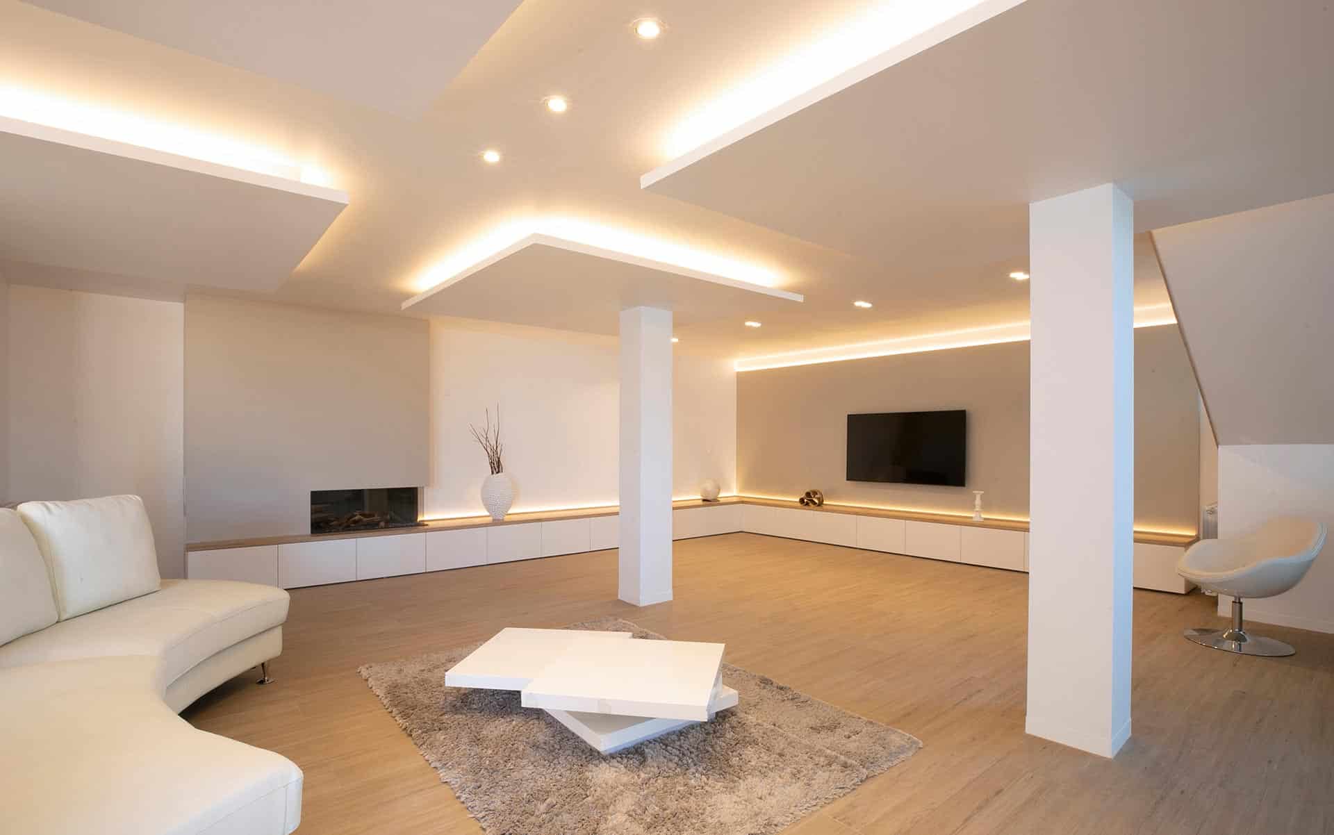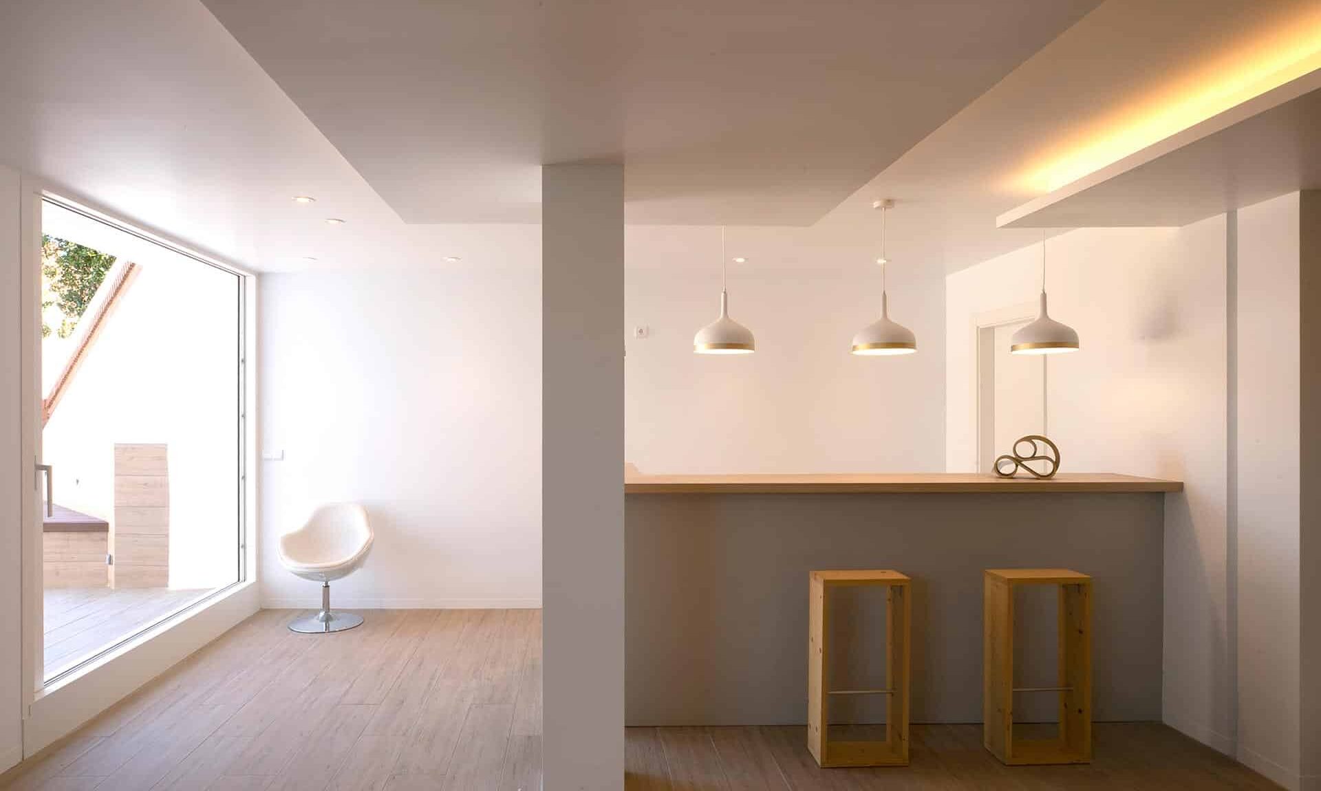 En el interior, la iluminación artificial cobra vital importancia: luces indirectas en foseados y ocultas tras el mobiliario dan calidez al ambiente. Desde el punto de vista del confort térmico, se instala una chimenea de gas interior que preside y calienta todo el espacio.