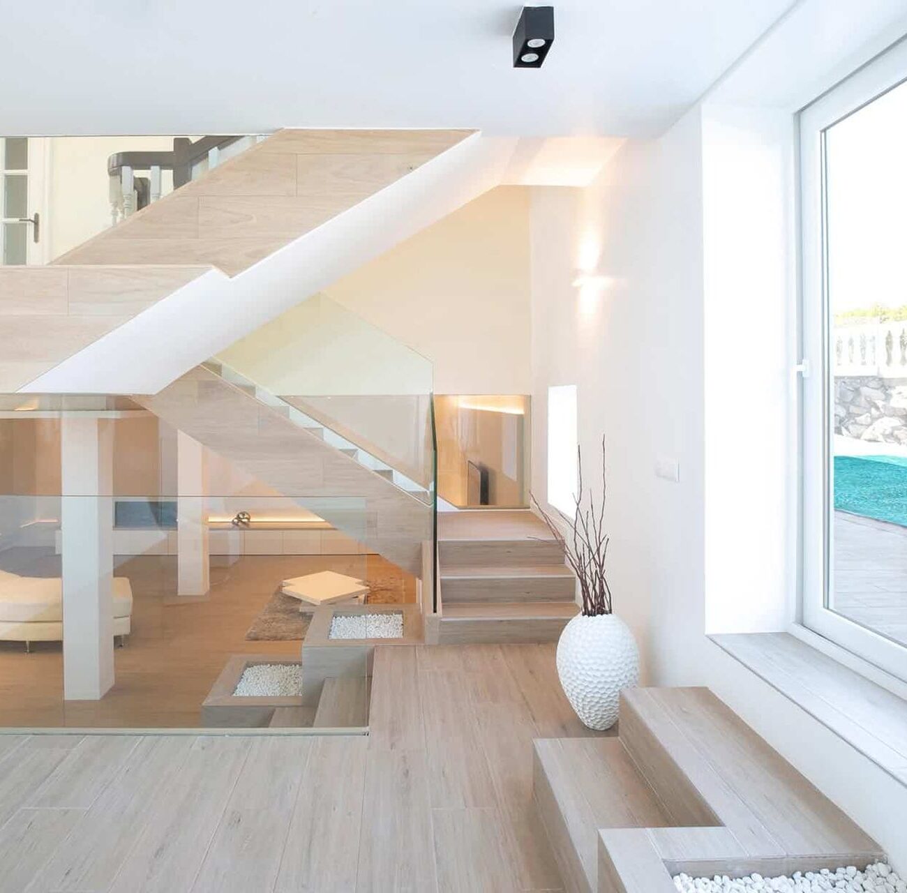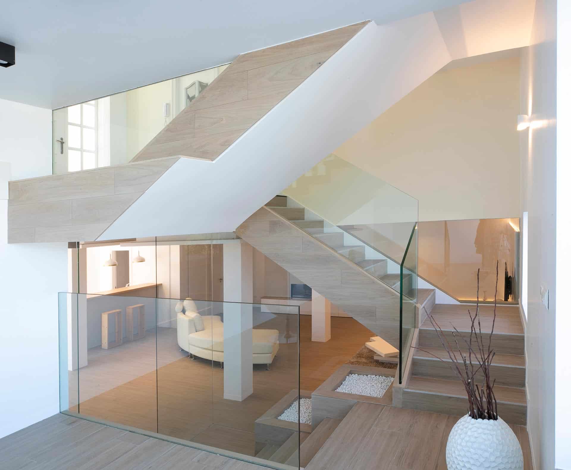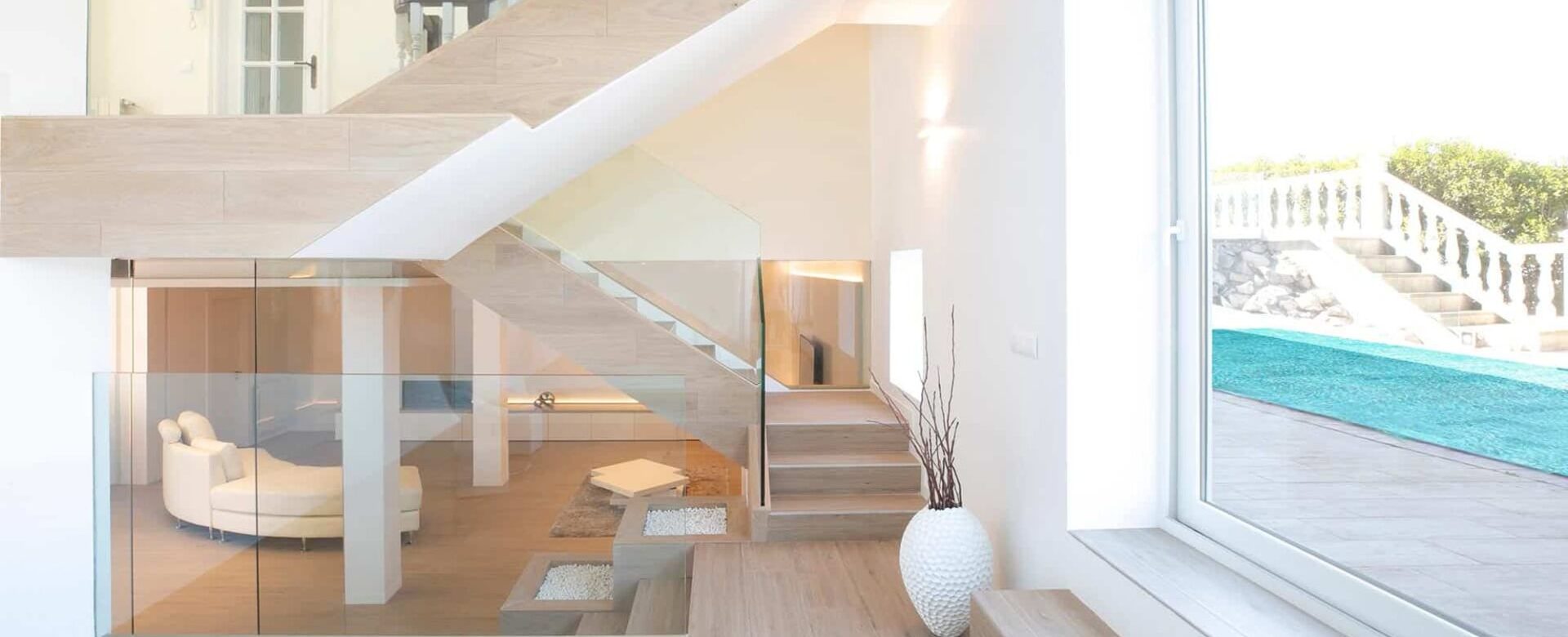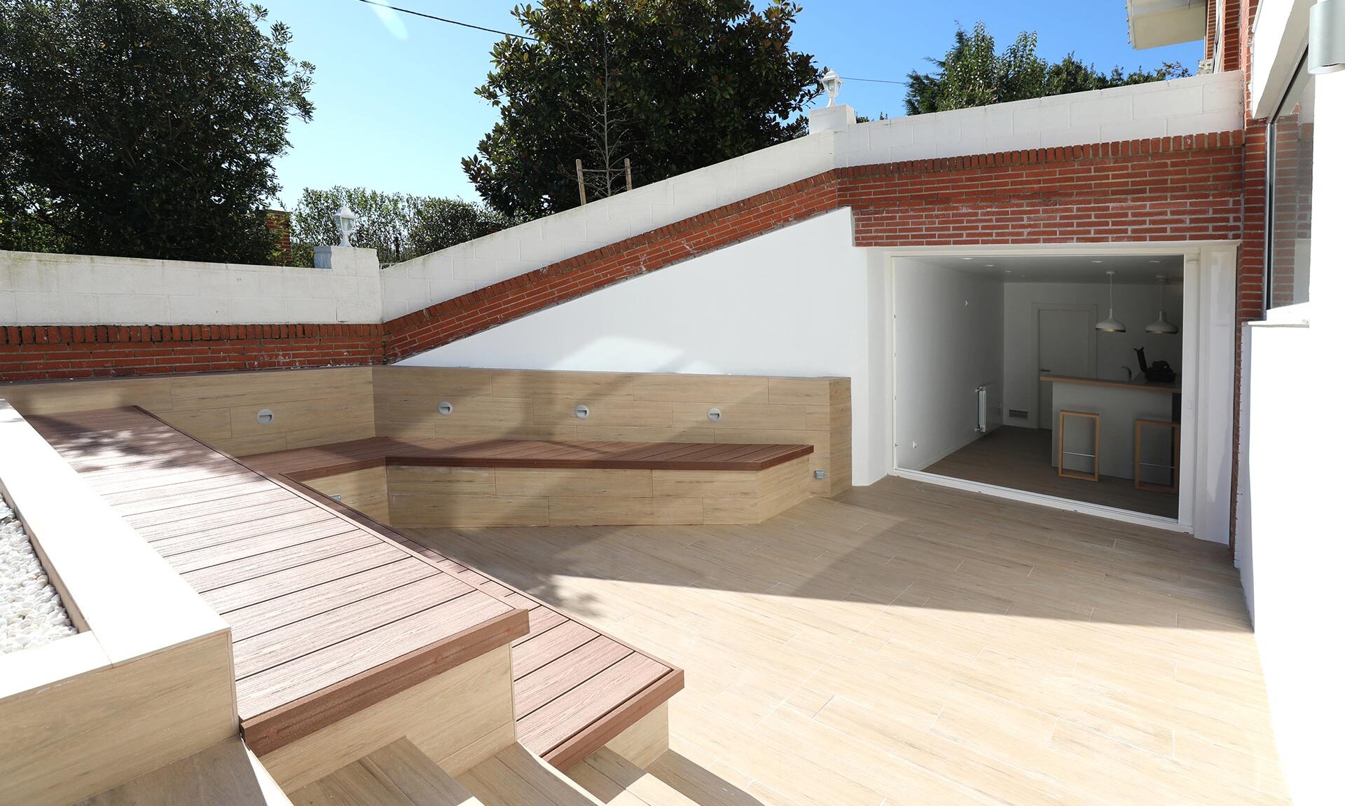 Uno de los retos de la reforma era el dotar a la vivienda de una salida directa desde la misma hasta la zona de la piscina situada a nivel de sótano. Para ello se abren nuevos ventanales, desde los que además se dota de luz natural a la estancia.