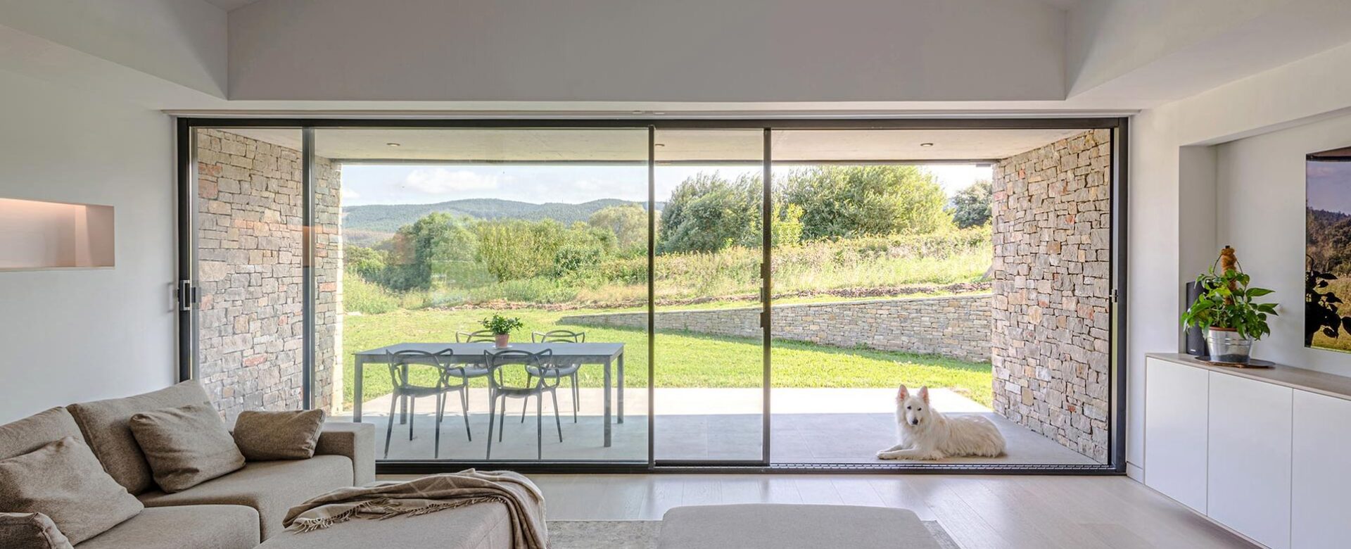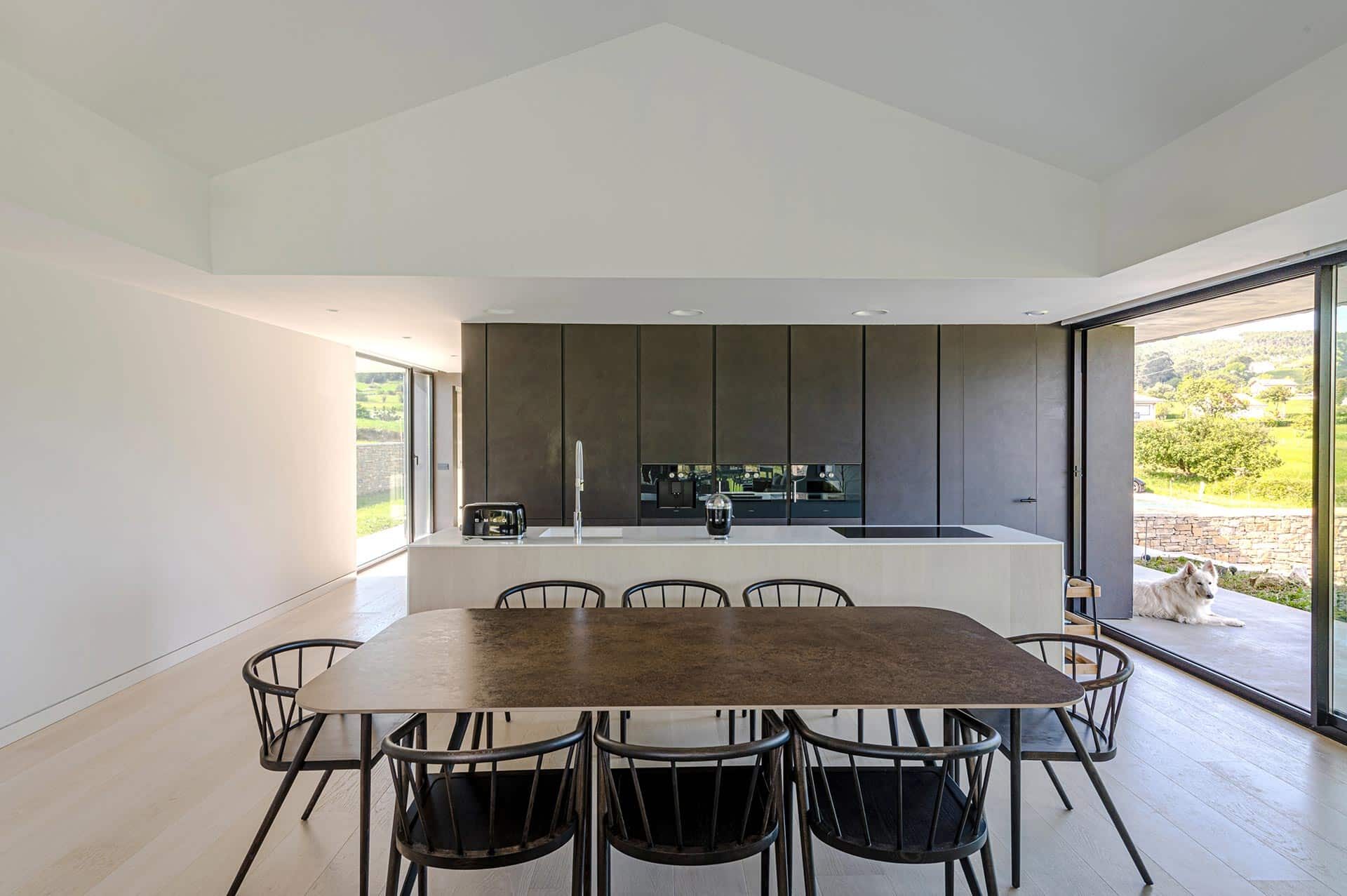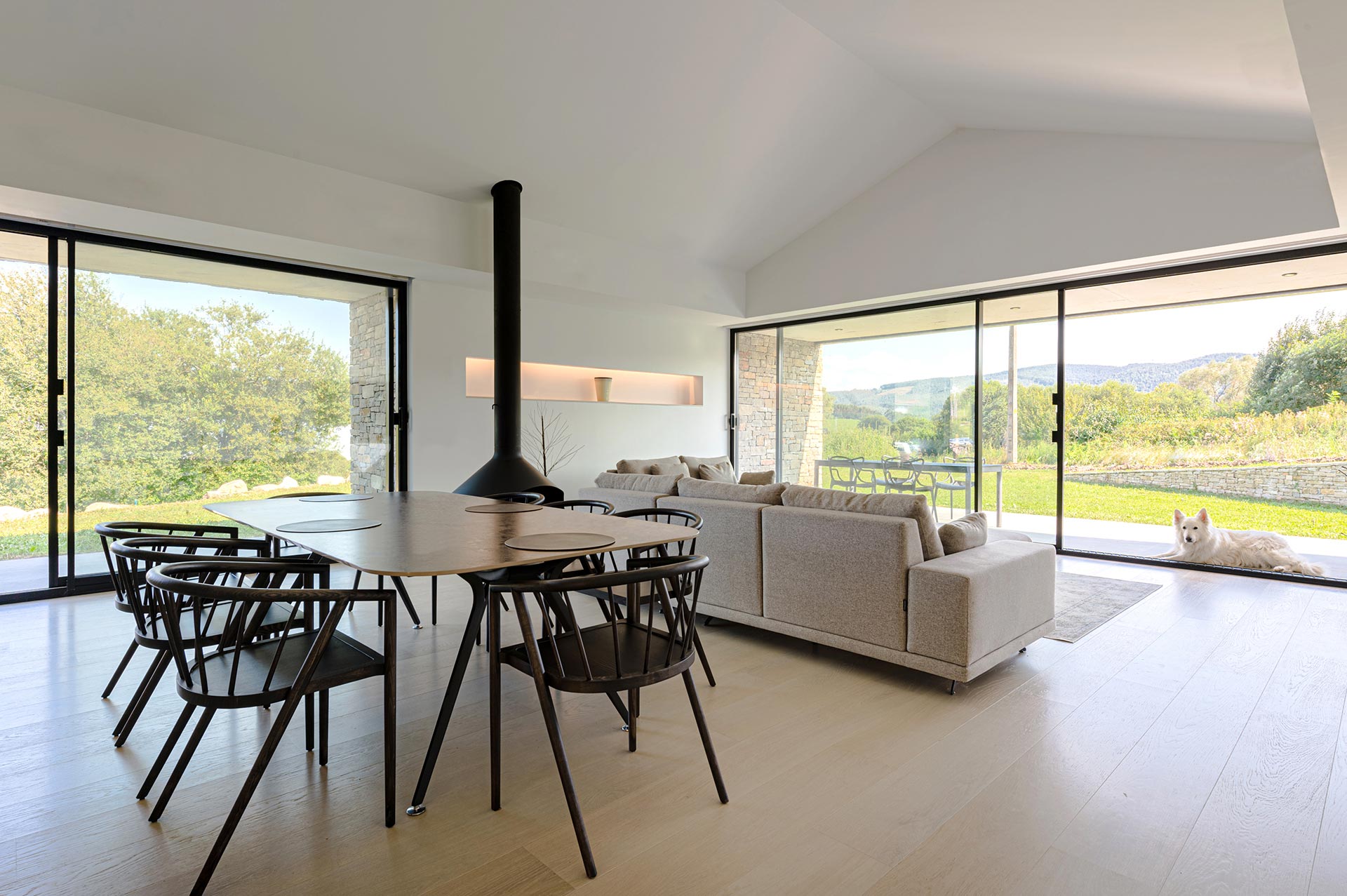 La relación ente el interior y el exterior se desdibuja mediante el empleo de porches y aleros que dilatan el espacio interior. Para dirigir el enfoque y enmarcar las vistas exteriores, se emplea un elegante gres porcelánico de tonos tostados que contrasta con la claridad introducida por las superficies acristaladas.