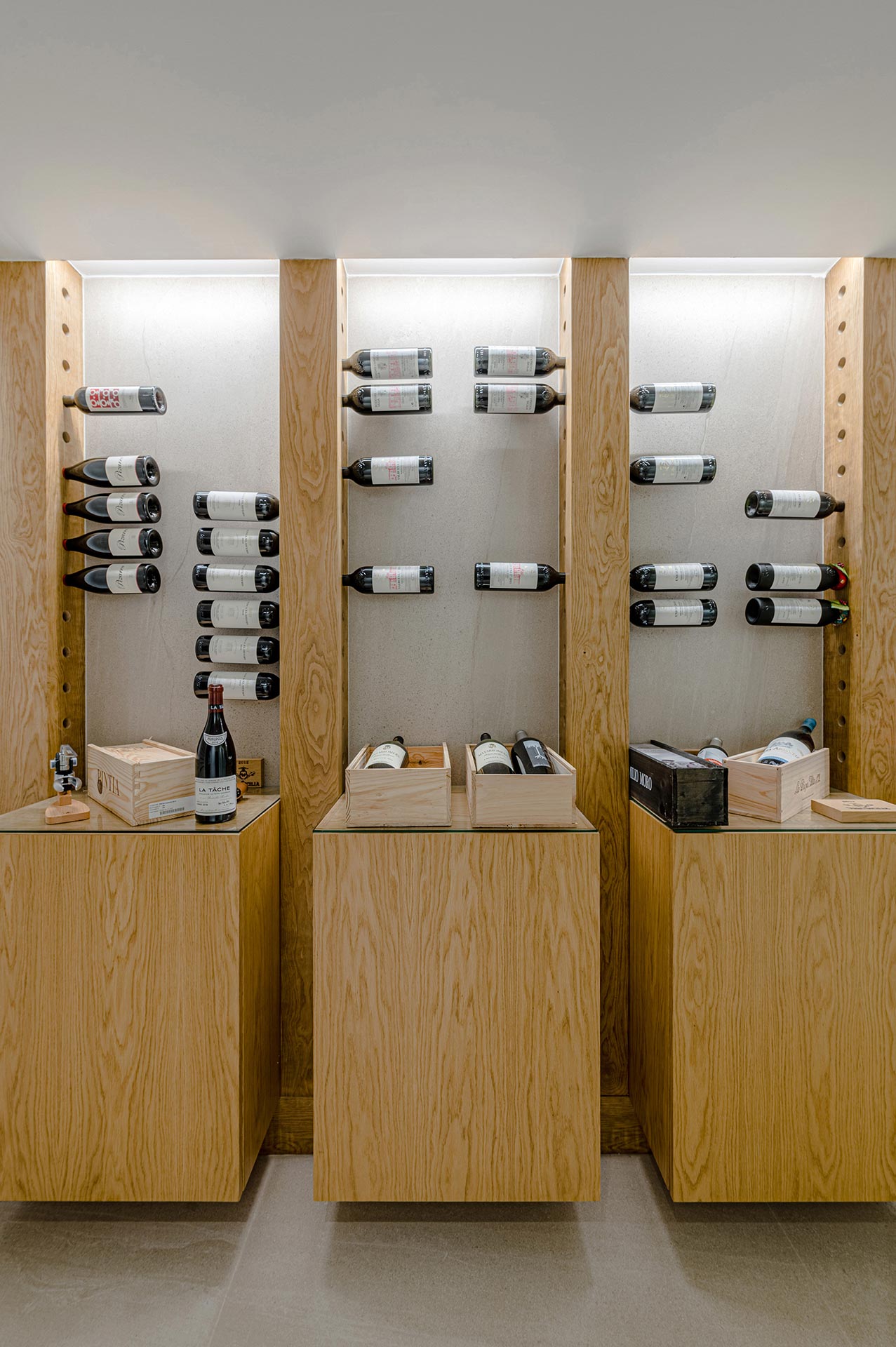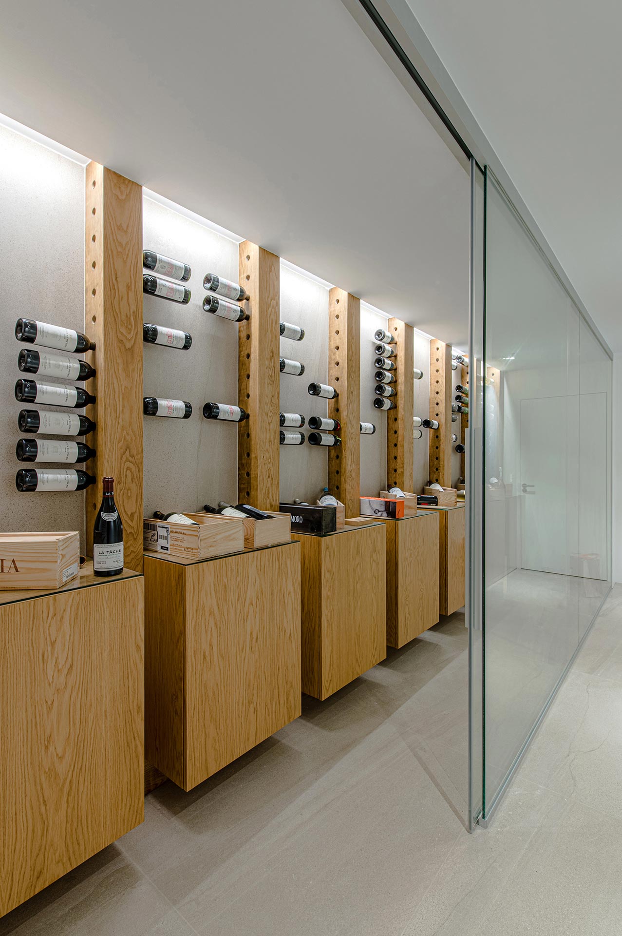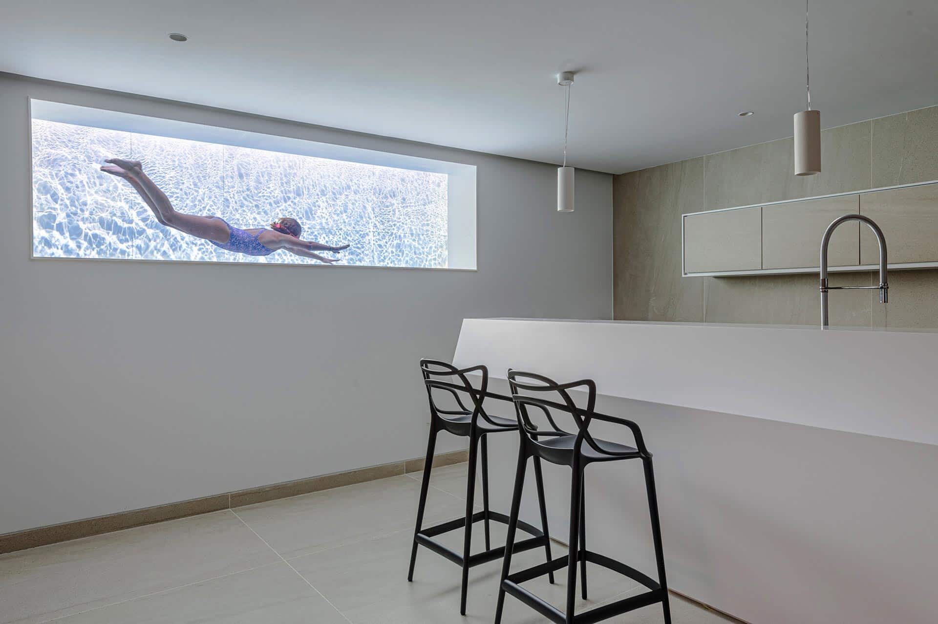 En el sótano se organizan una serie de espacios lúdicos con un carácter más privado que buscan cerrarse al entorno y protegerse de la climatología. Esta atmósfera más densa se potencia con la apertura de un gran ventanal hacia la piscina que evidencia la sensación de estar enterrado o más bien “sumergido”.