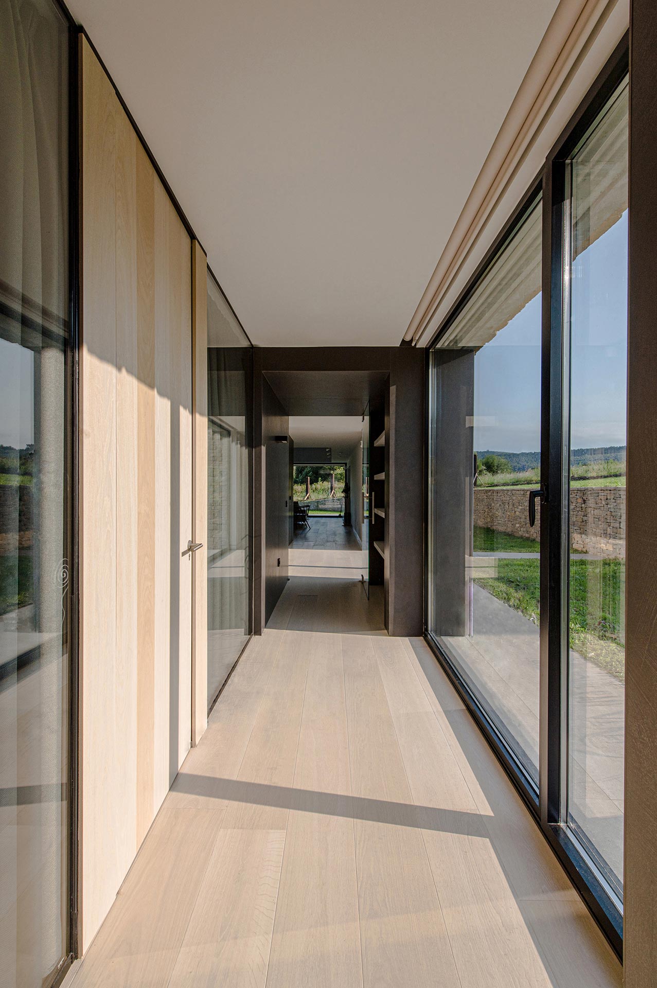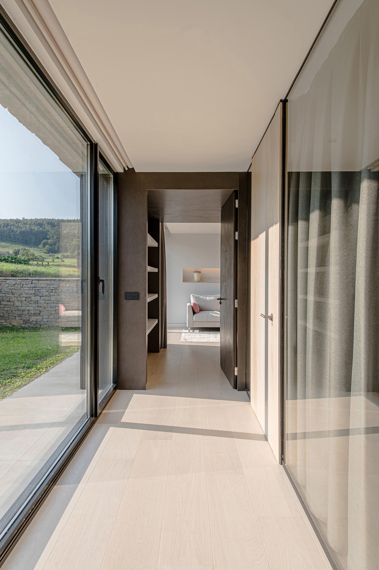 La distribución interior se realiza a través de un gran corredor orientado al sol de poniente en el que se alternan grandes huecos abiertos al jardín semienterrado, y espacios de almacenamiento integrados en el cerramiento. A través de este corredor, los dormitorios pueden abrirse o protegerse del sol de la tarde por medio de cerramientos interiores textiles y de vidrio.